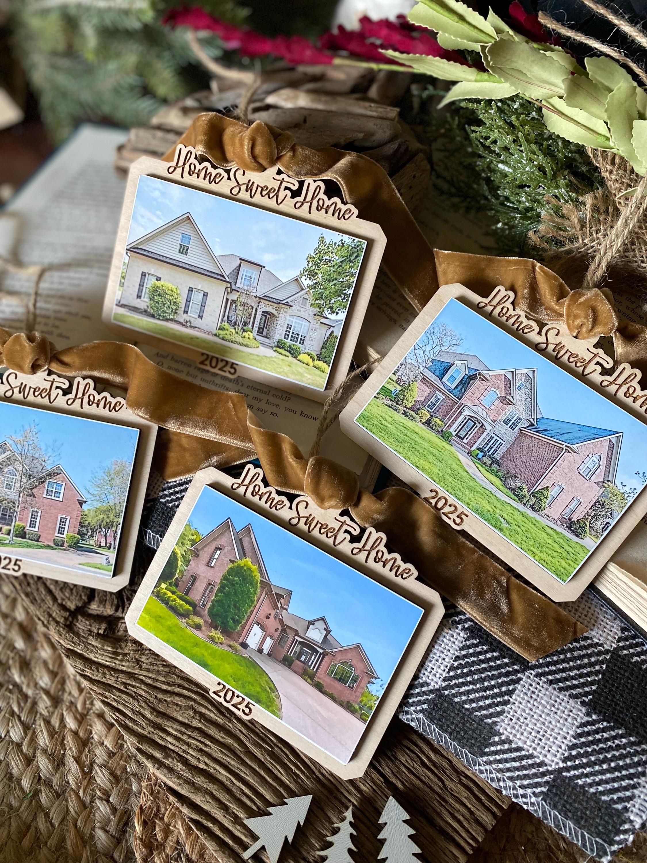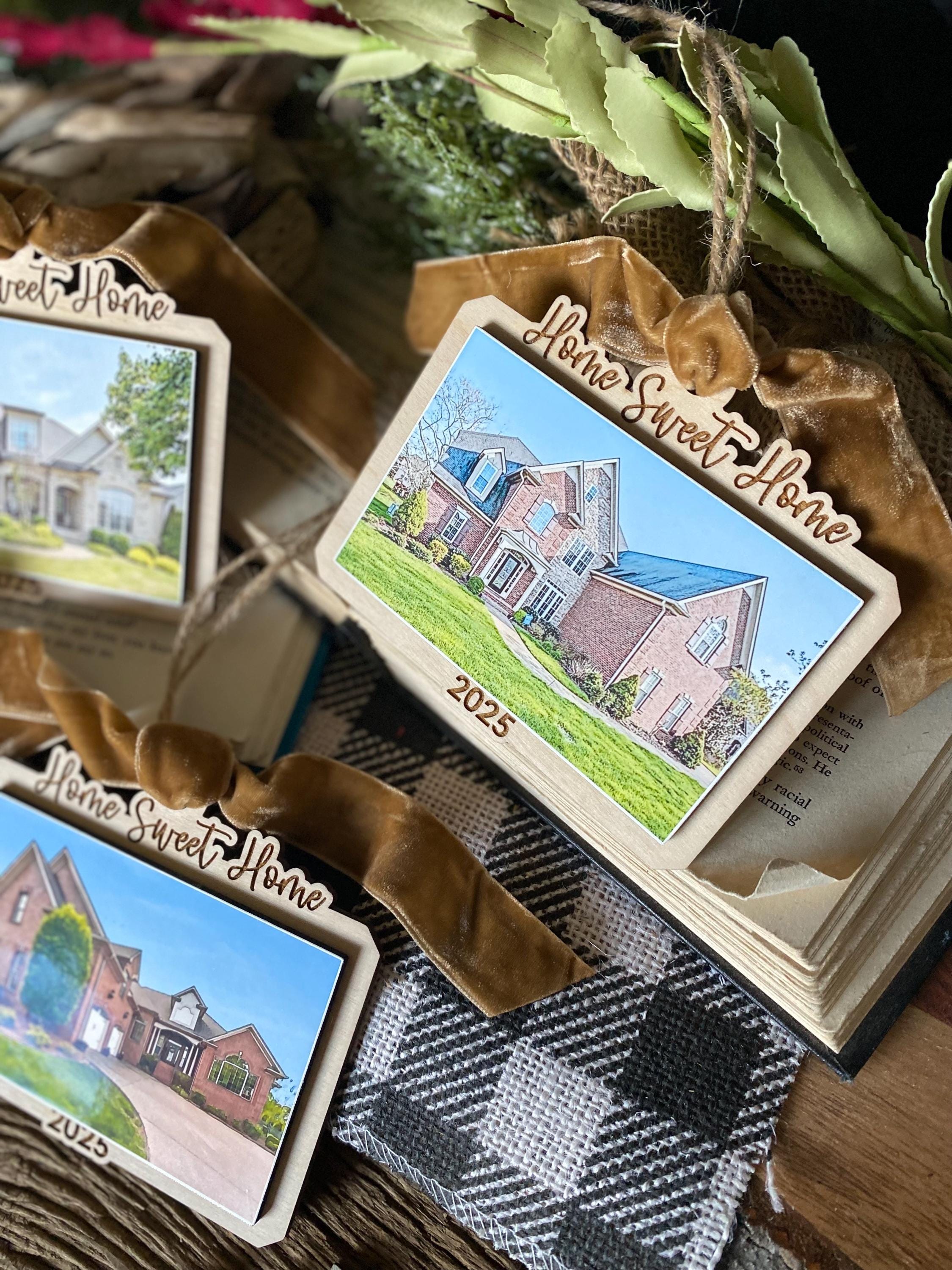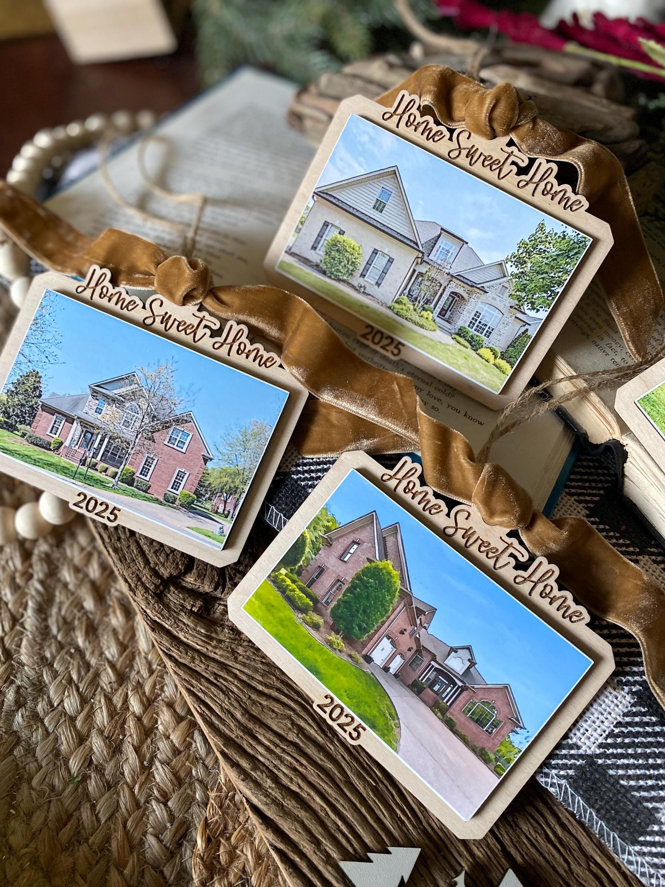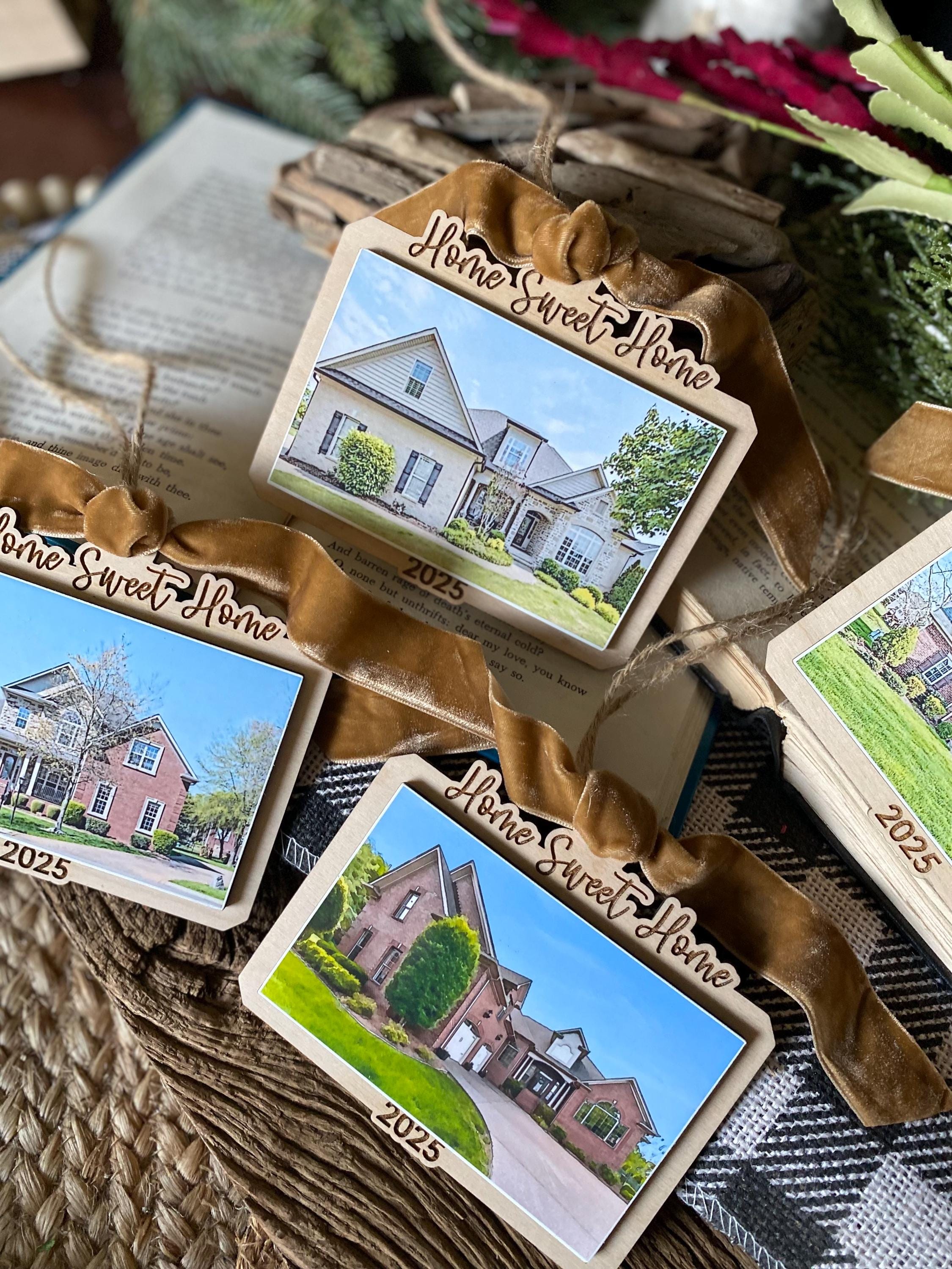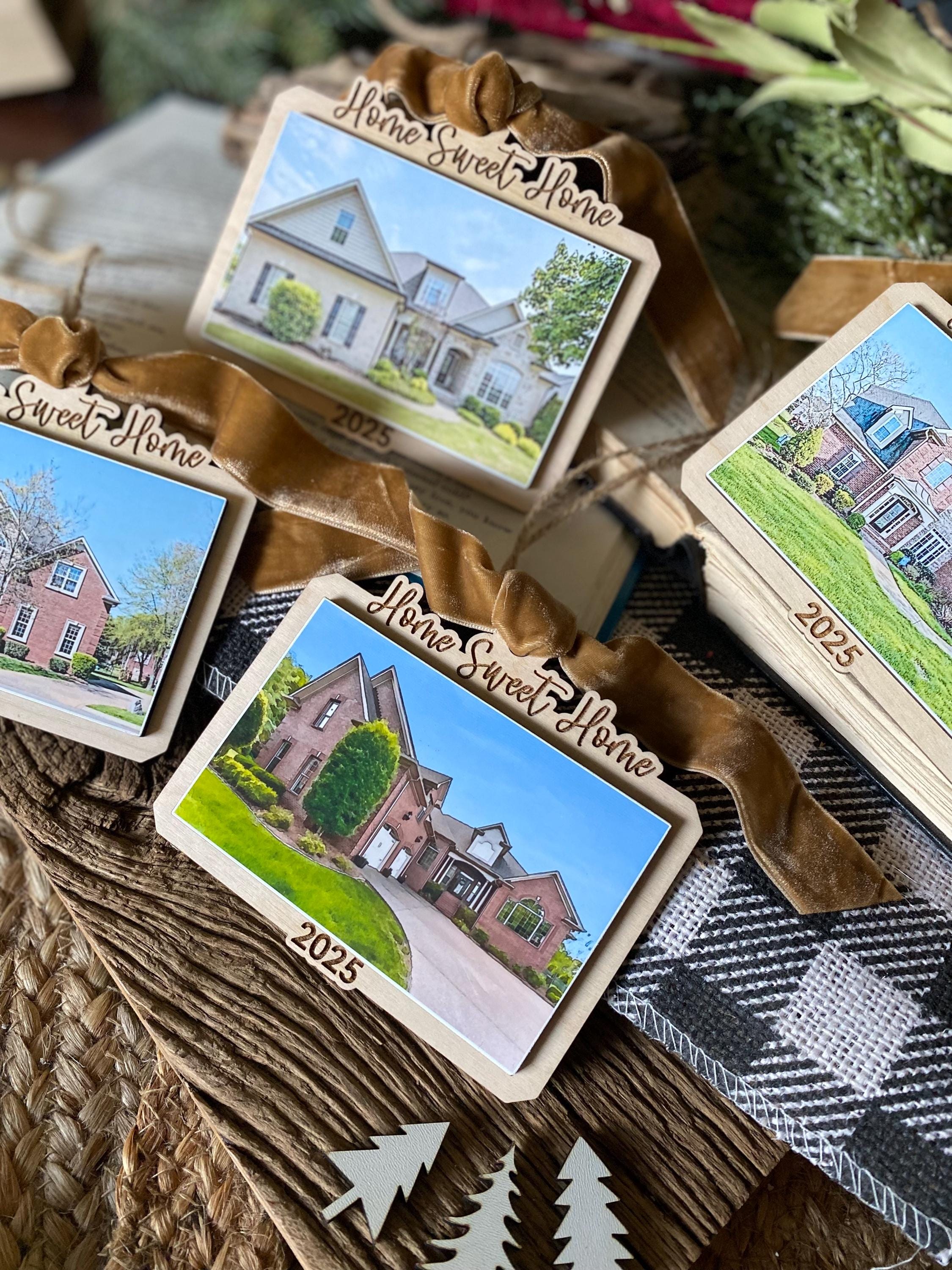 This keepsake ornament features your actual home photo, professionally printed and mounted on a beautiful wood-style ornament, finished with a soft velvet ribbon for an elegant touch. Personalized with the year, it’s the perfect way to commemorate a first home, forever home, or new chapter.