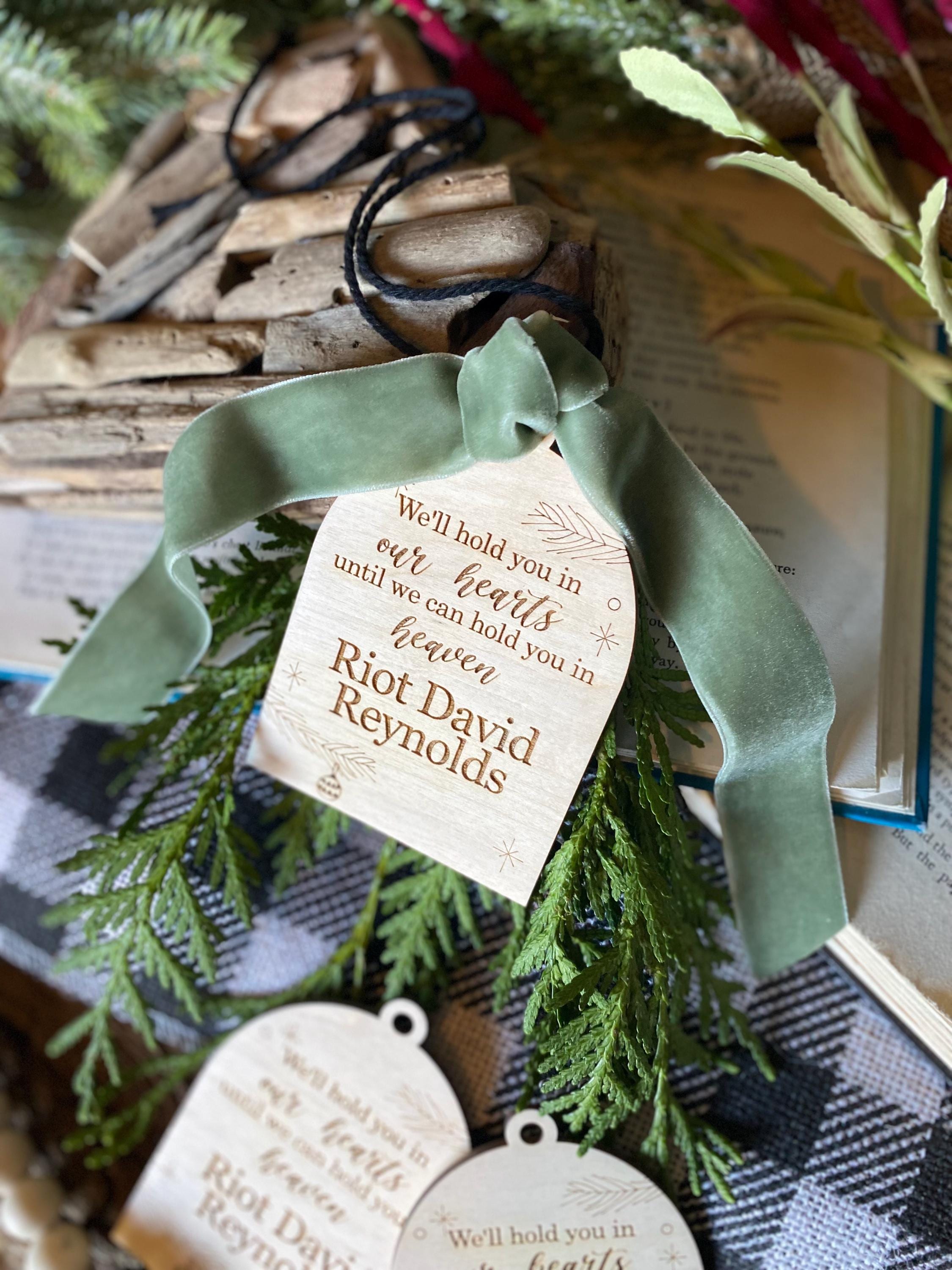 Remember your loved one in a beautifully meaningful way with this personalized Christmas ornament. Handcrafted from natural wood and laser-engraved for detail that won’t fade. Finished with a luxurious velvet bow and accented with evergreen-style greenery, it brings warmth, charm, and elegance to your holiday décor.