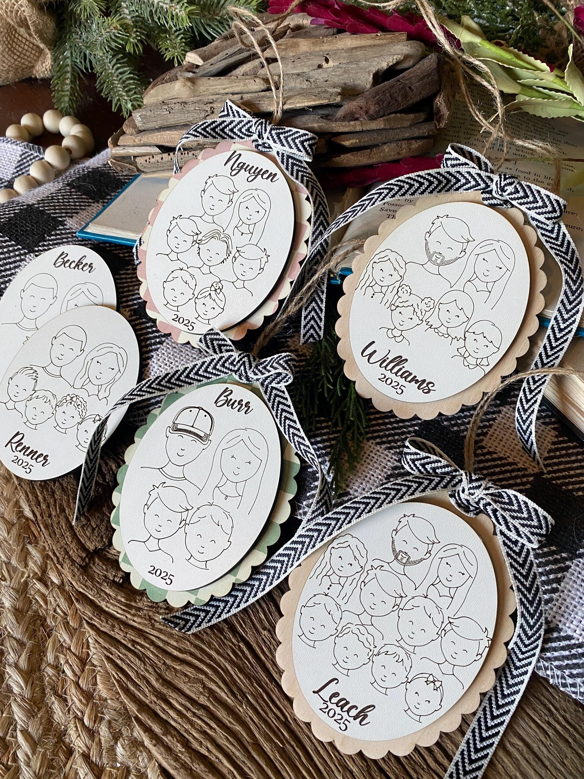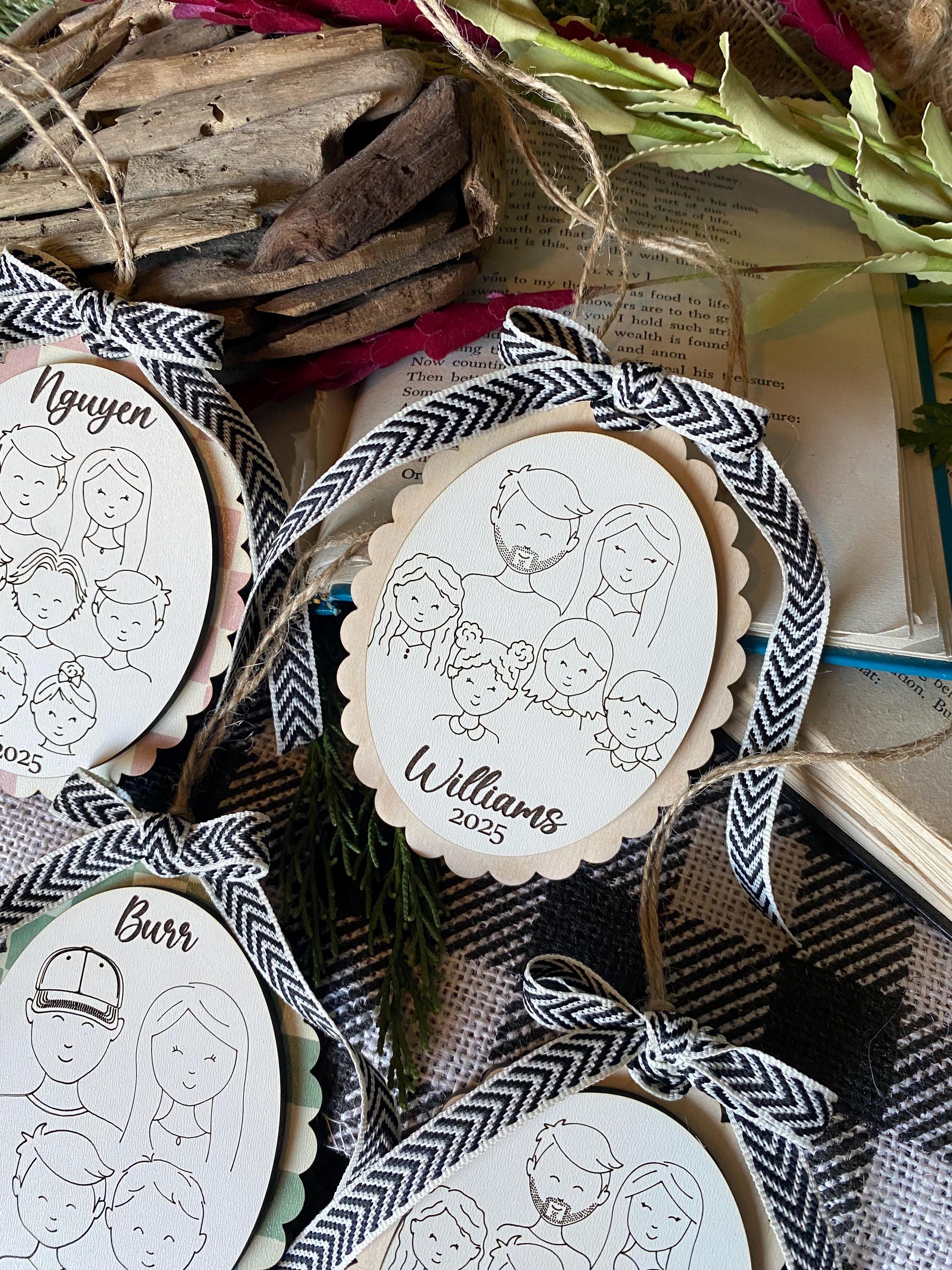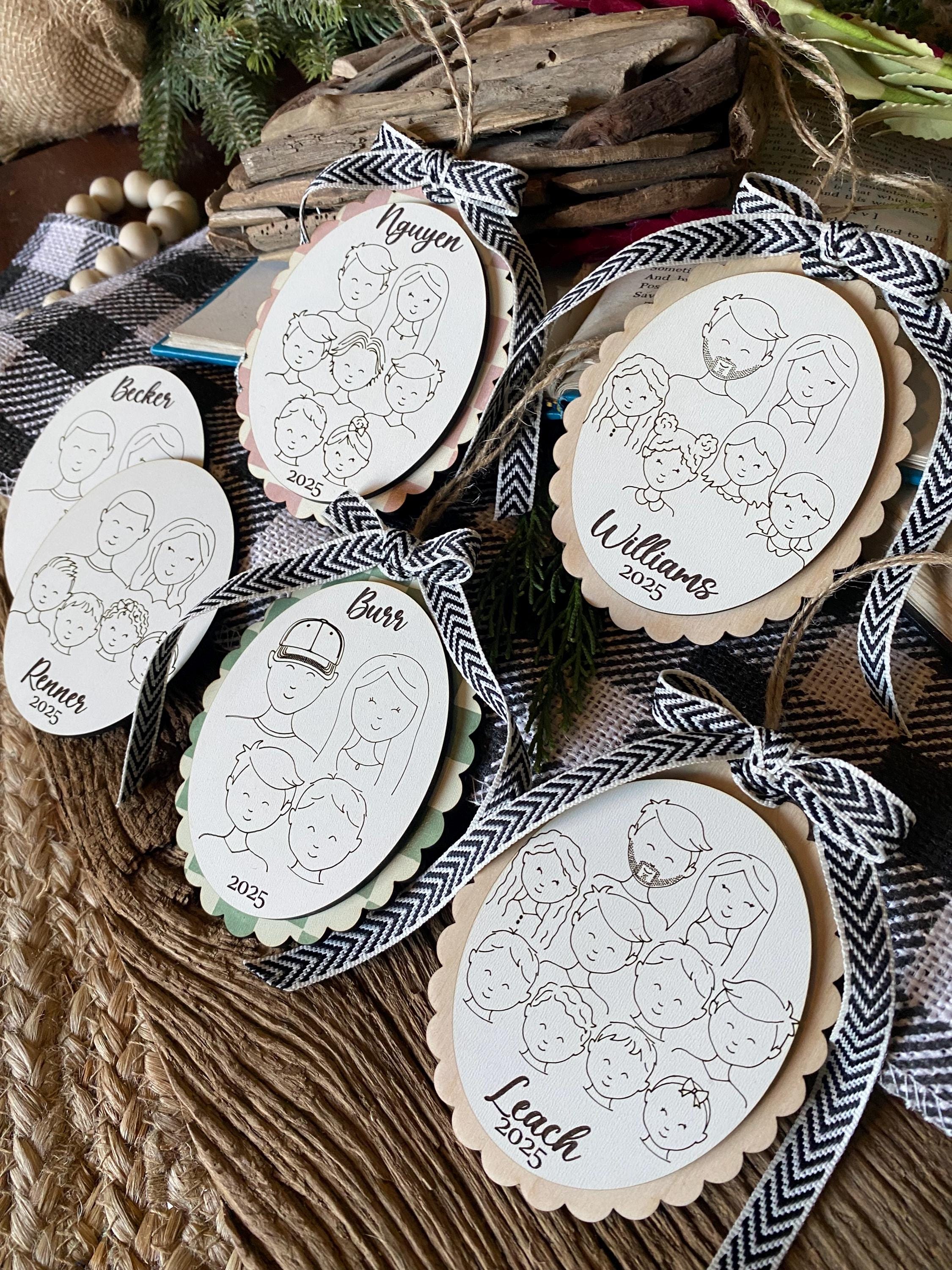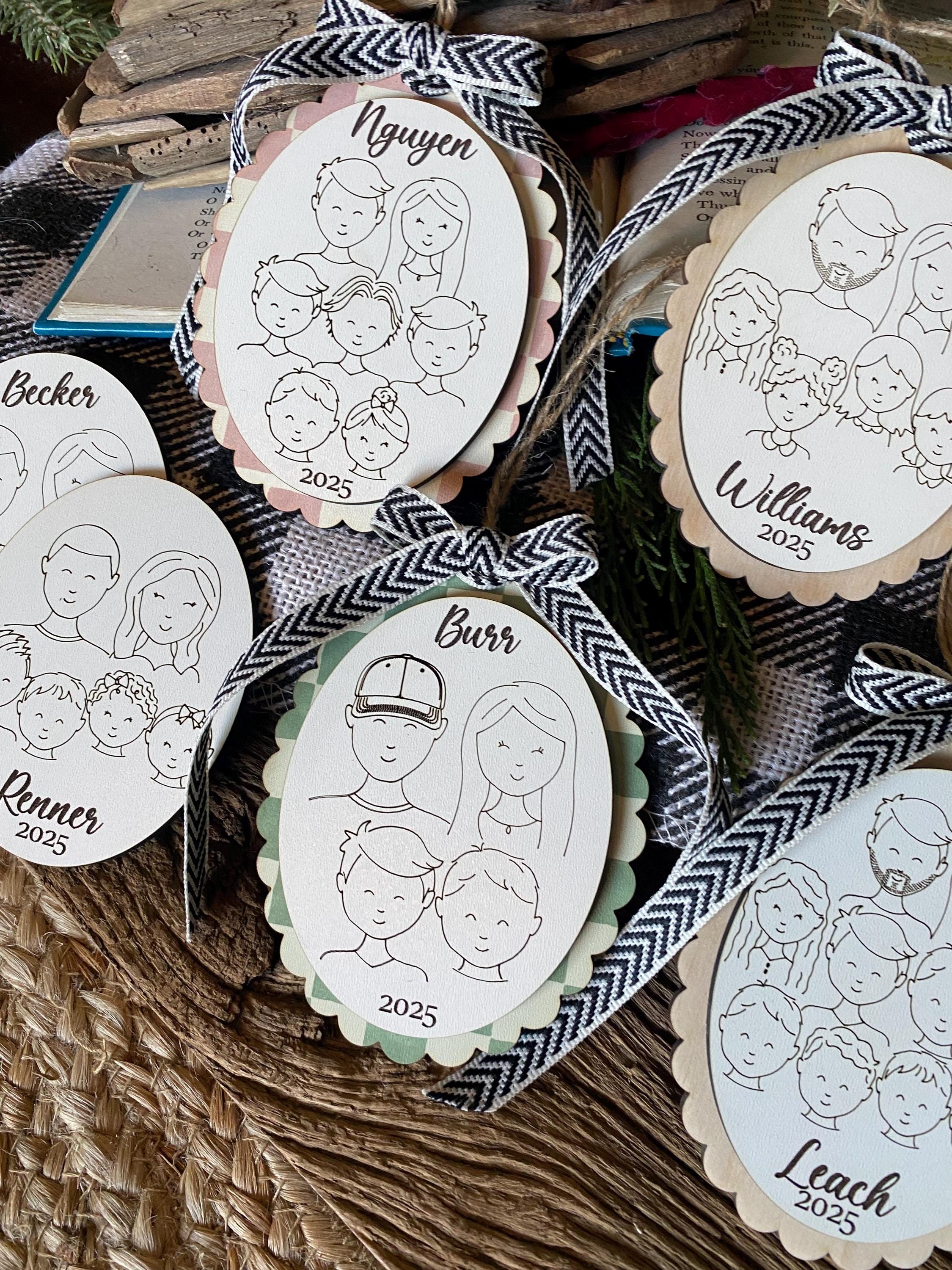 Family Drawing Christmas Ornament, Custom Family Portrait Ornament, Personalized Family Name Ornament, Line Art, Pet & Child Add-On, Laser Engraved Keepsake Christmas Ornament