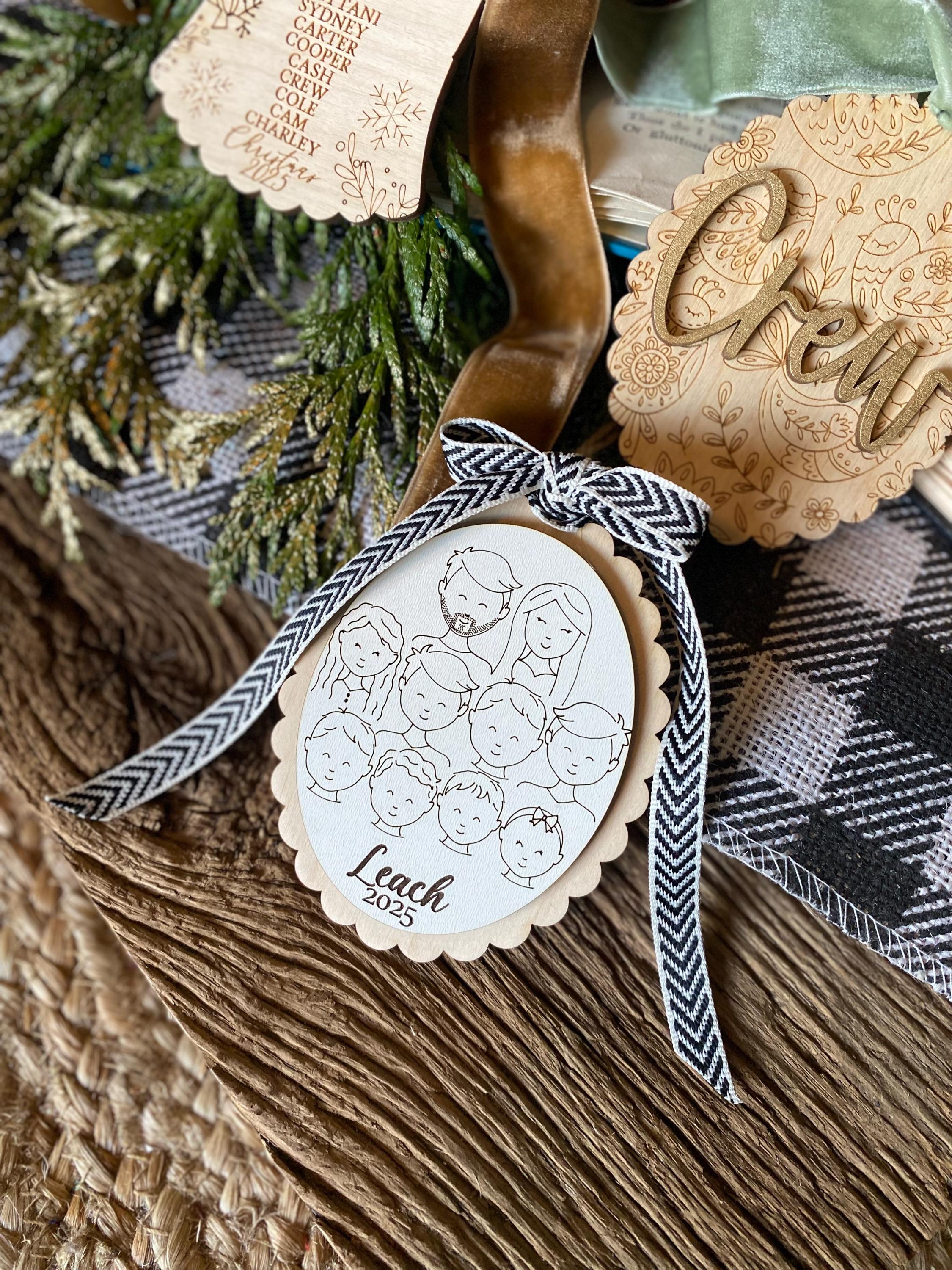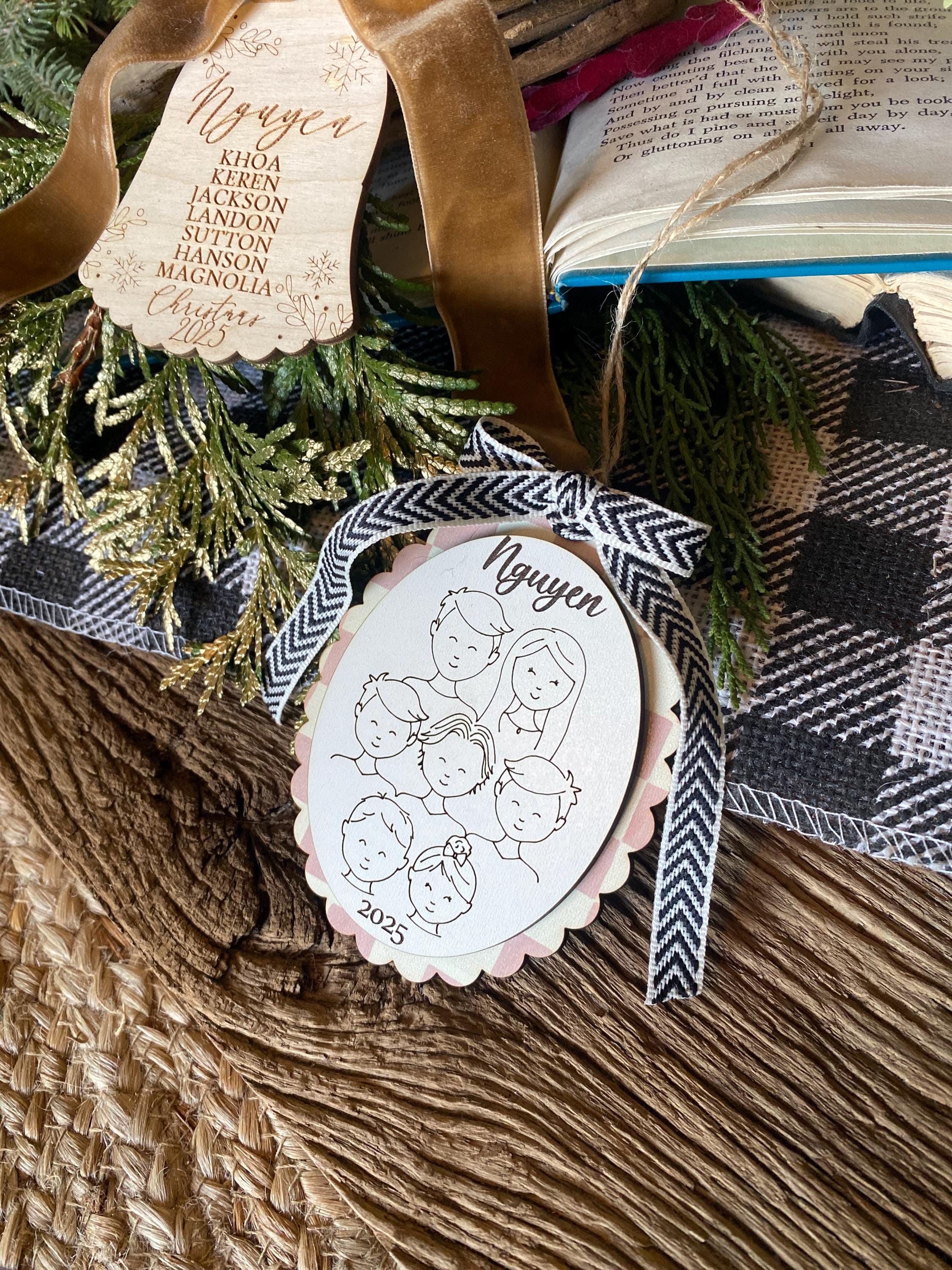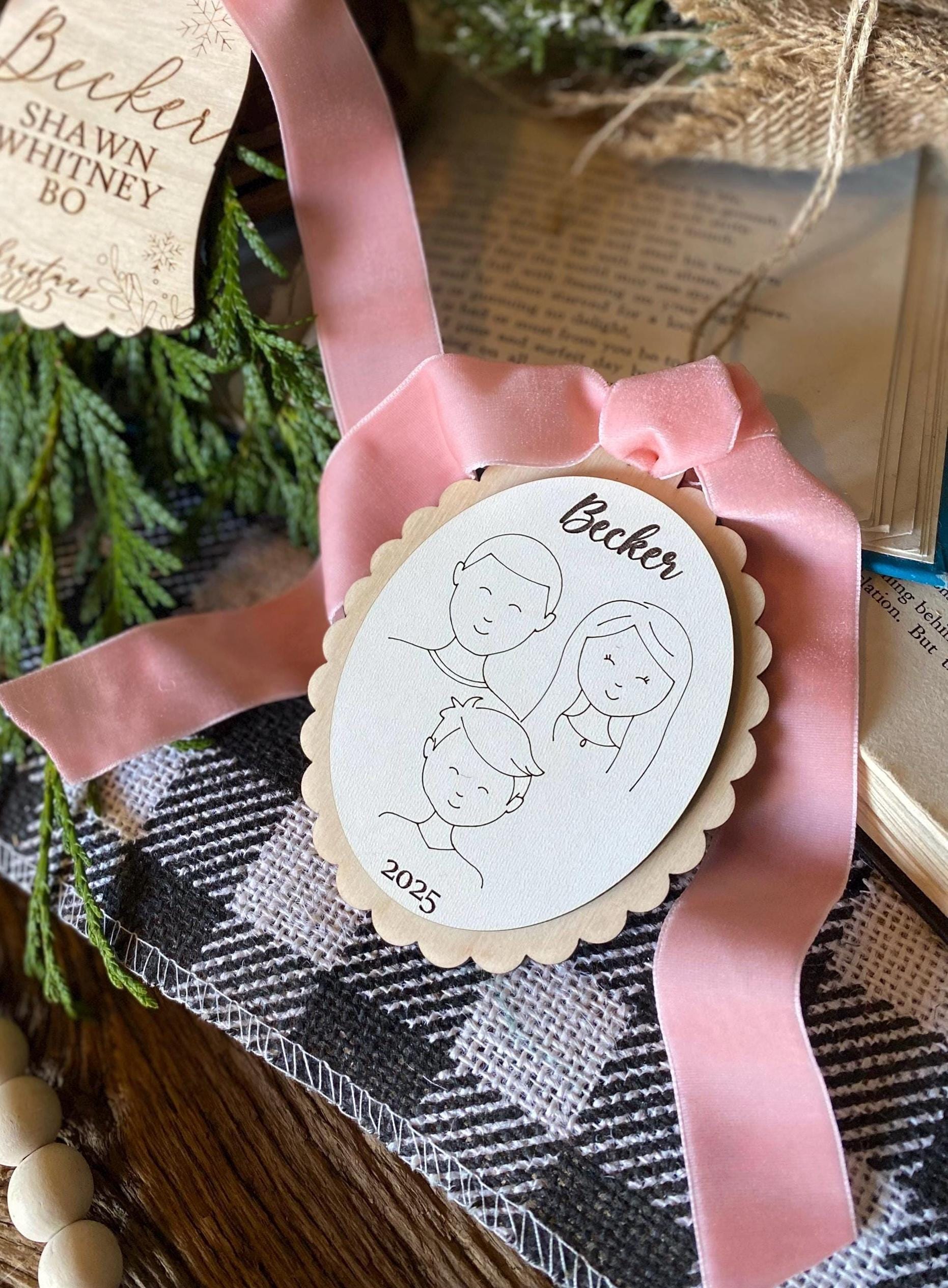 A timeless keepsake ornament featuring your family in simple hand-drawn line art. Personalized with names, pets, and year. Laser engraved on a scalloped wood ornament and finished with ribbon for hanging. A meaningful and minimal addition to your holiday tree — or a thoughtful gift for loved ones.