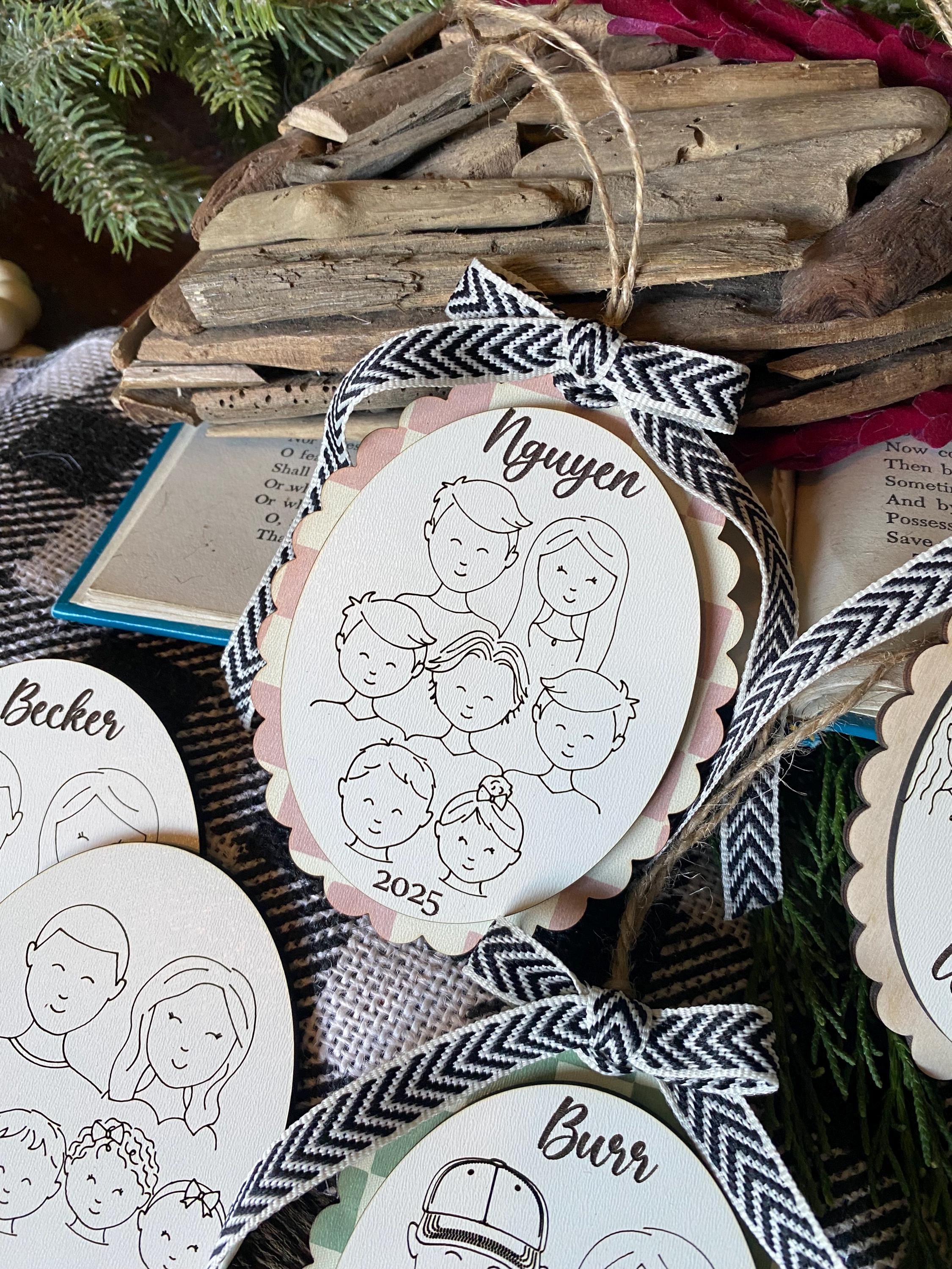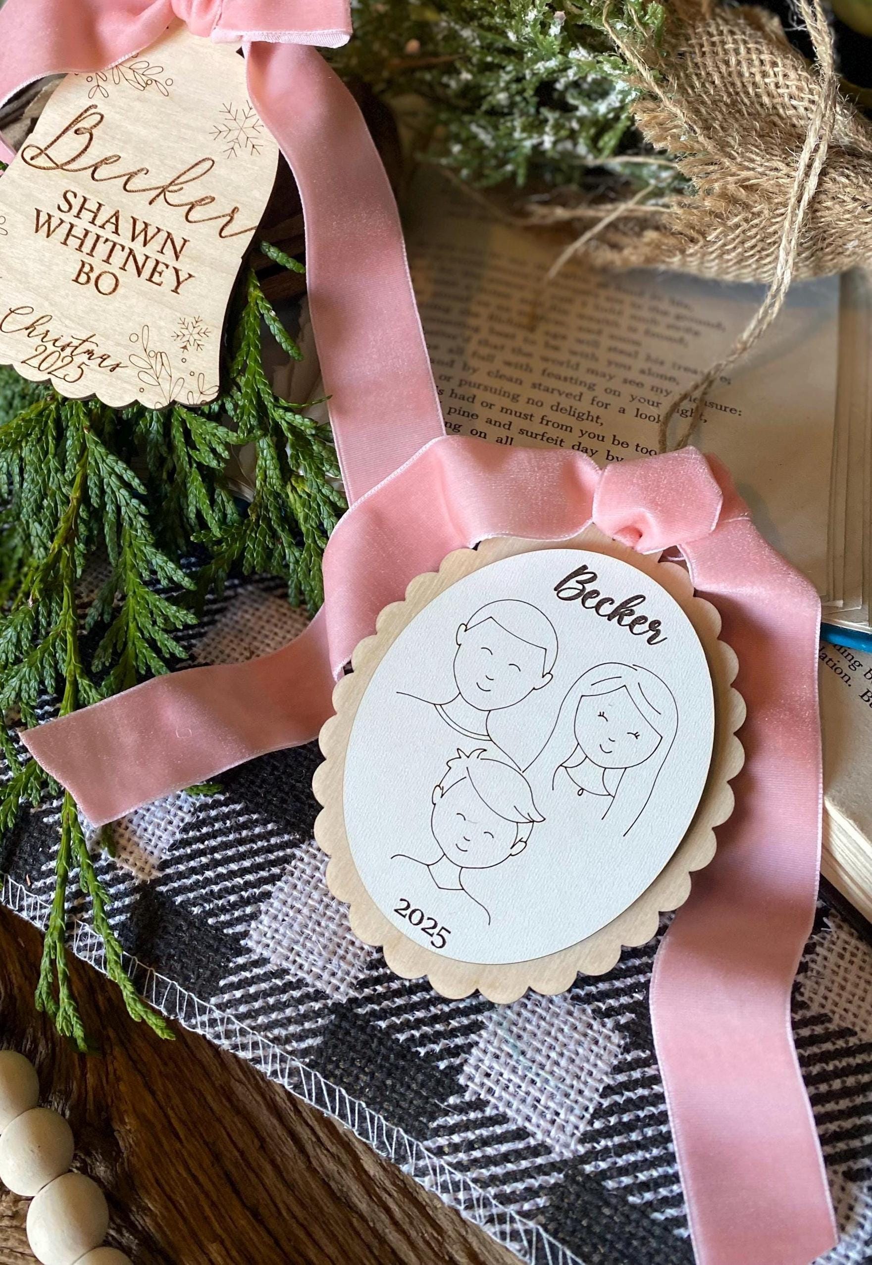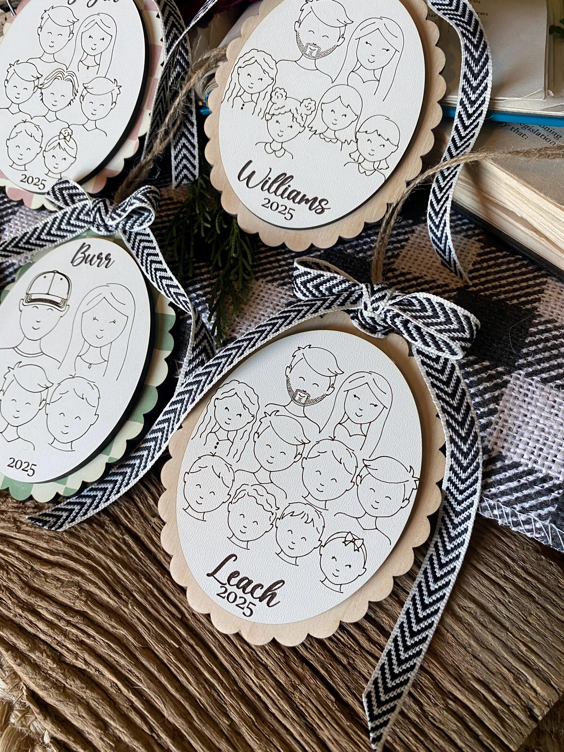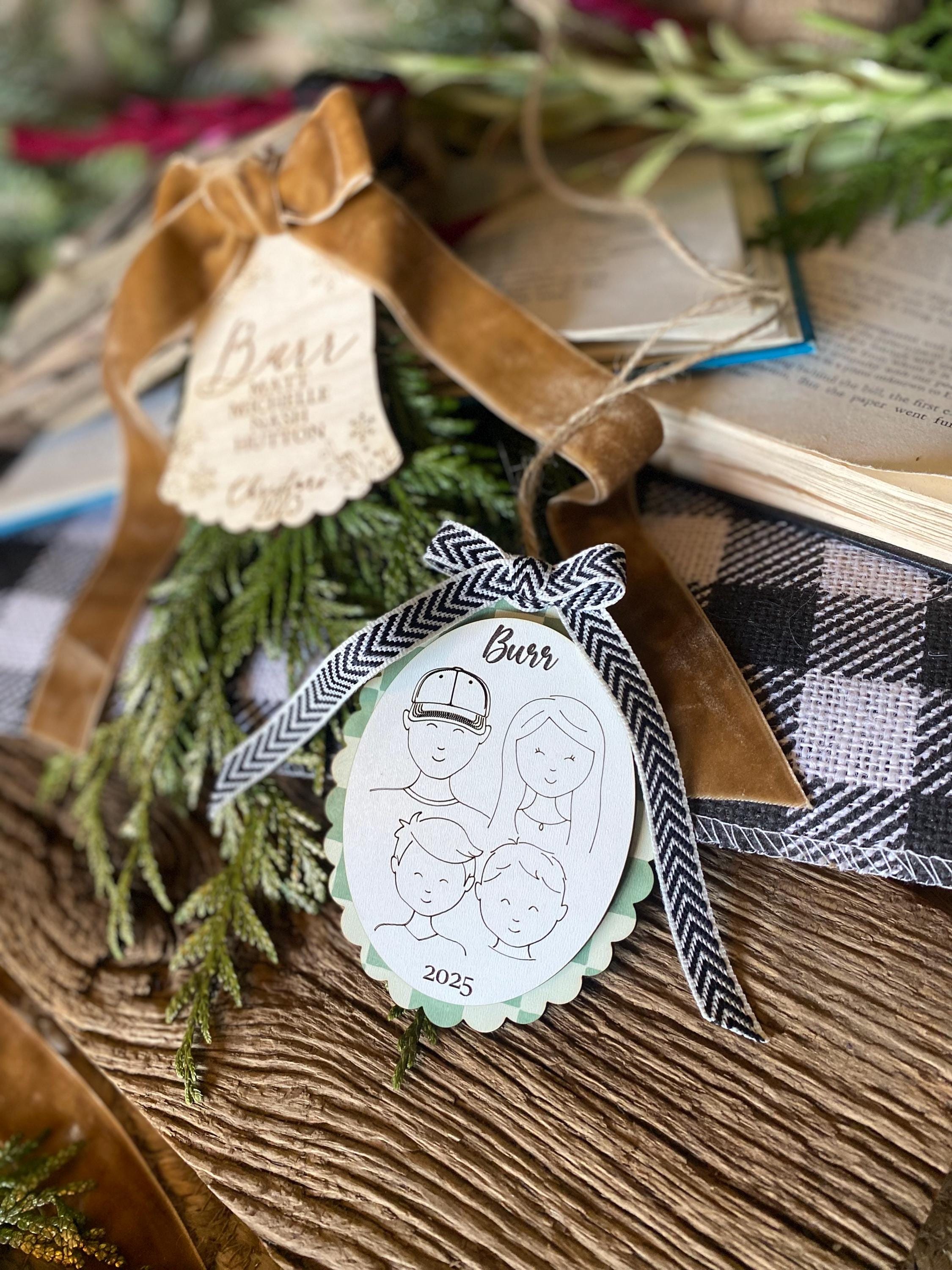 A timeless keepsake ornament featuring your family in simple hand-drawn line art. Personalized with names, pets, and year. Laser engraved on a scalloped wood ornament and finished with ribbon for hanging. A meaningful and minimal addition to your holiday tree — or a thoughtful gift for loved ones.