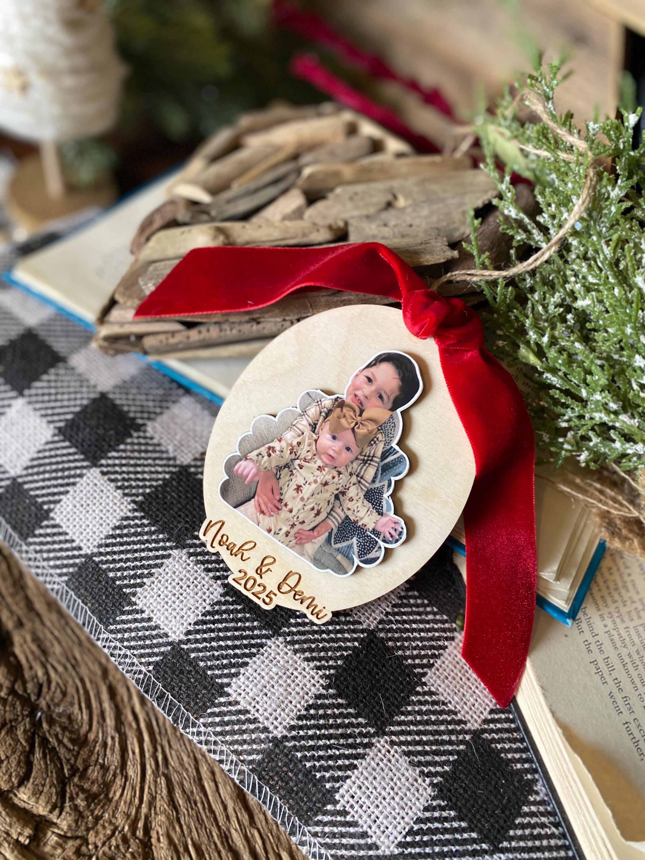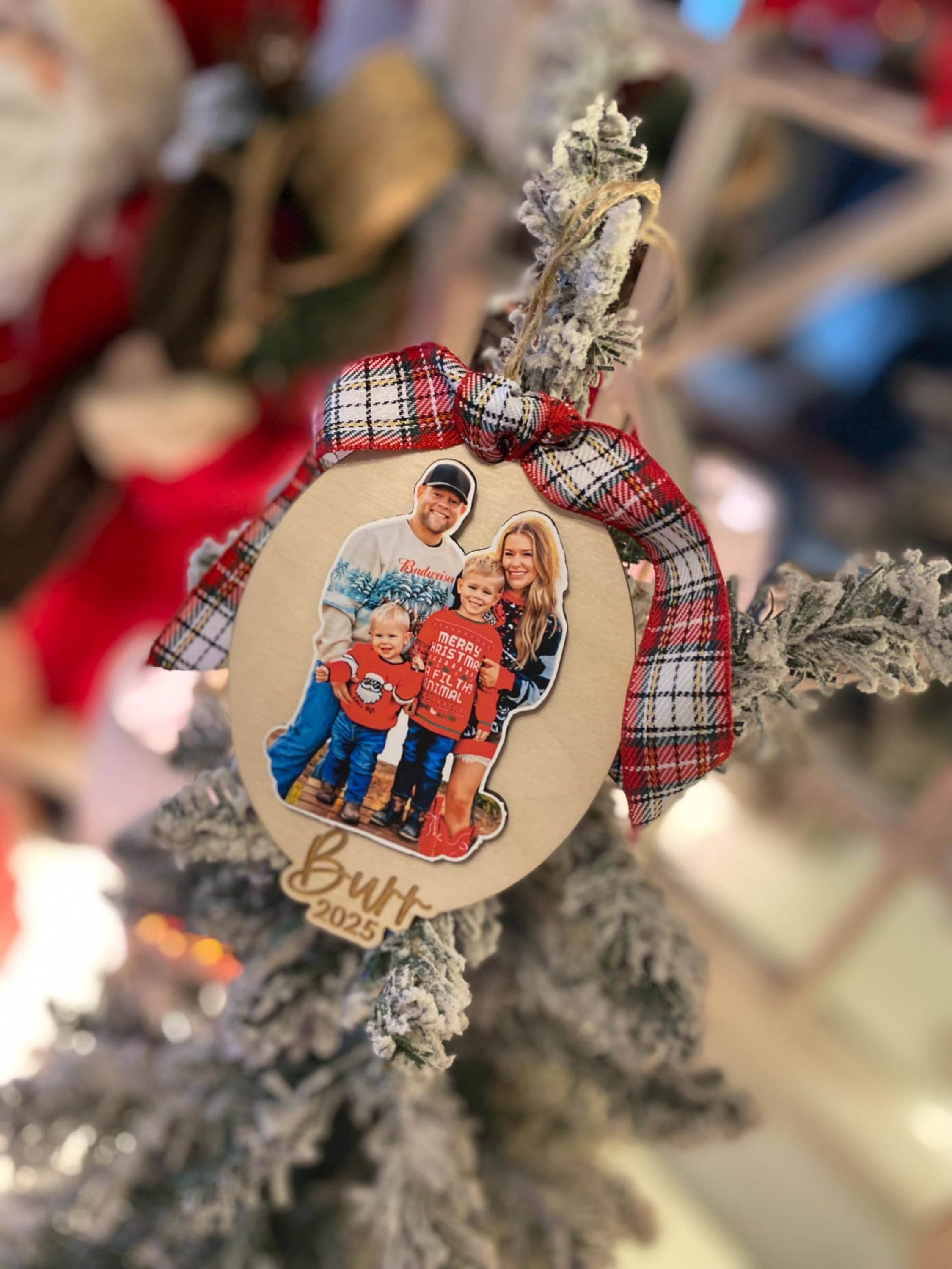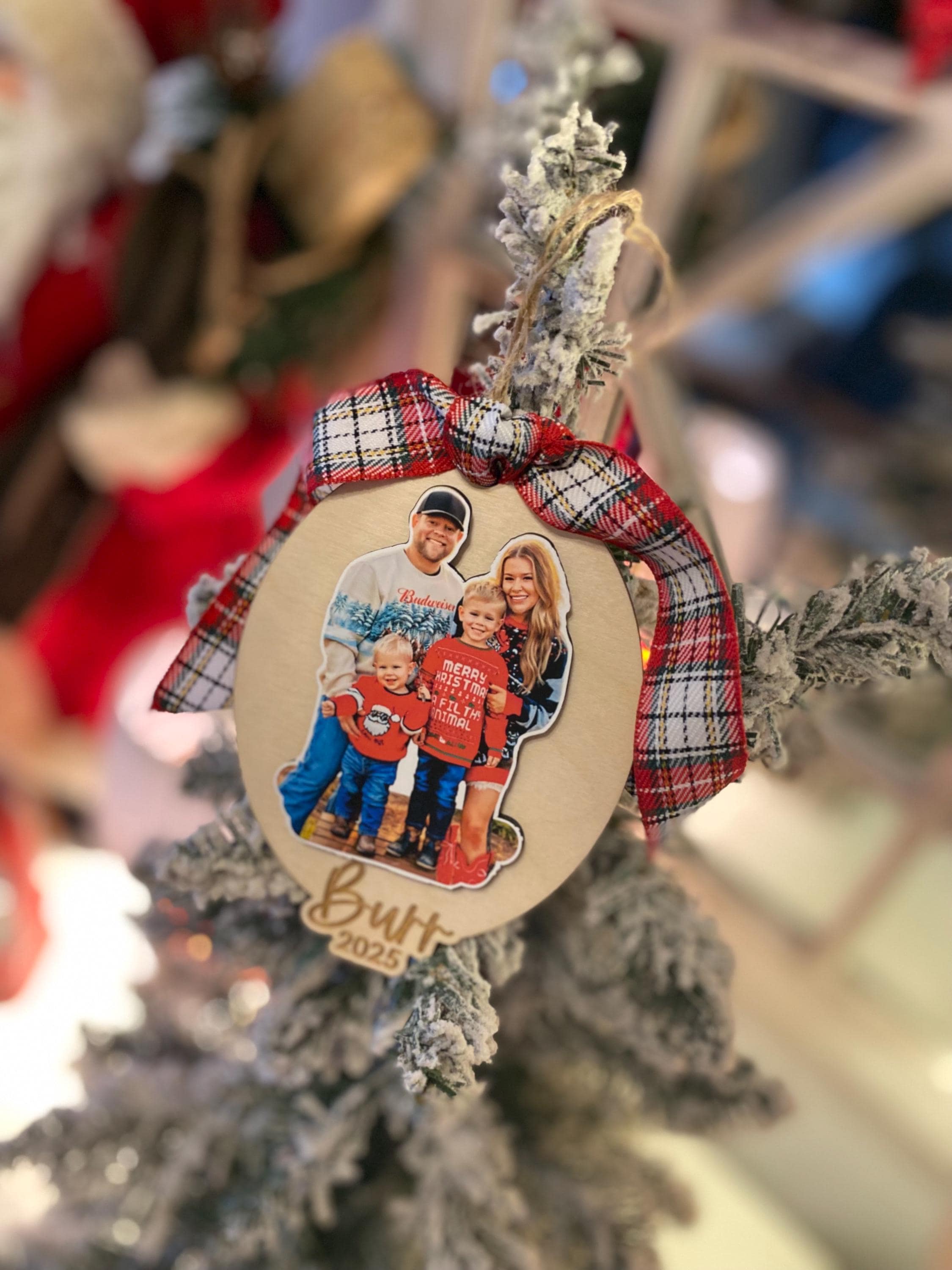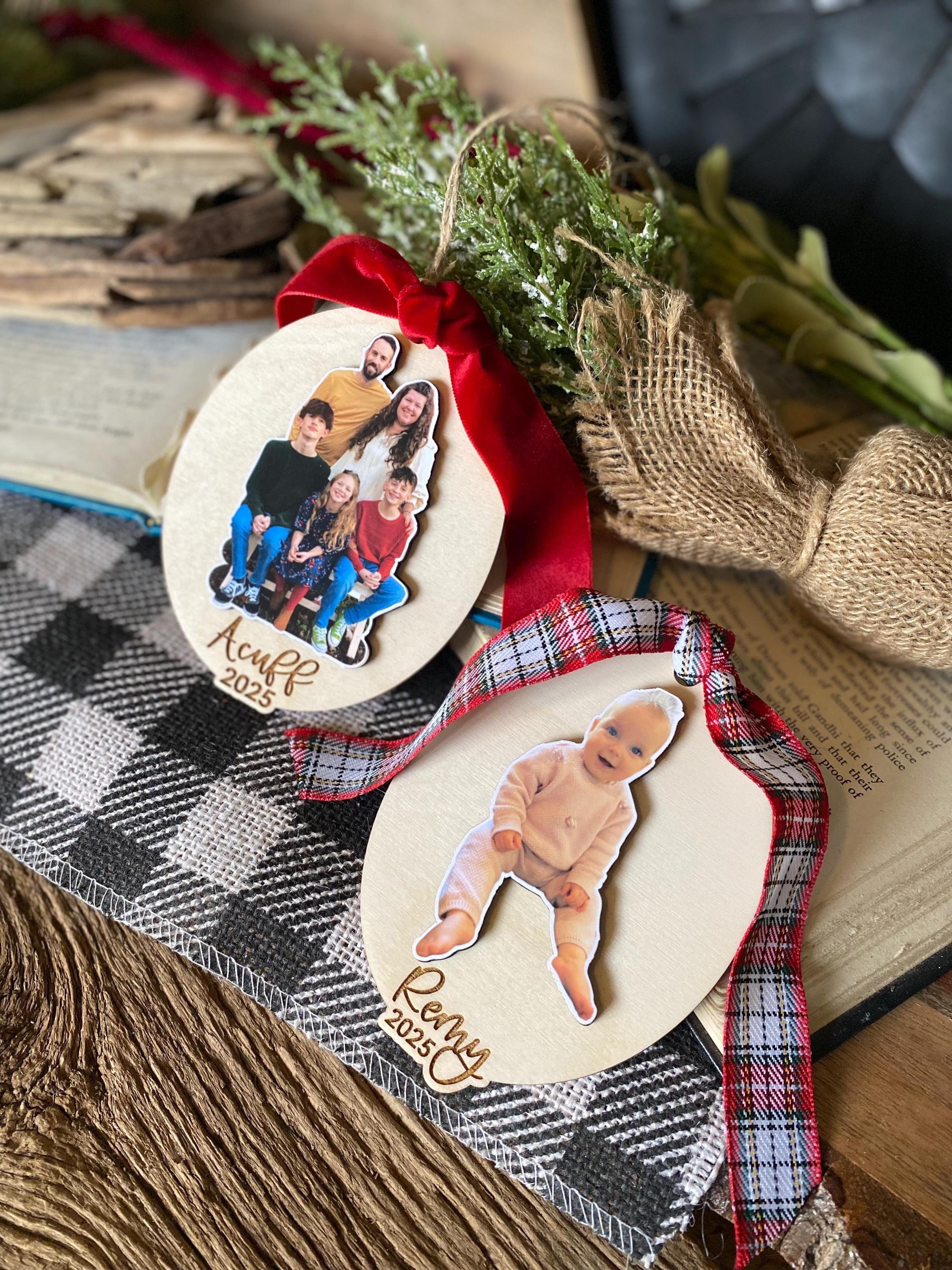 Each ornament features your photo beautifully cut and mounted on a natural wood base, creating a timeless keepsake you’ll cherish for years. A perfect gift for parents, grandparents, teachers, godparents, and your own holiday tree.