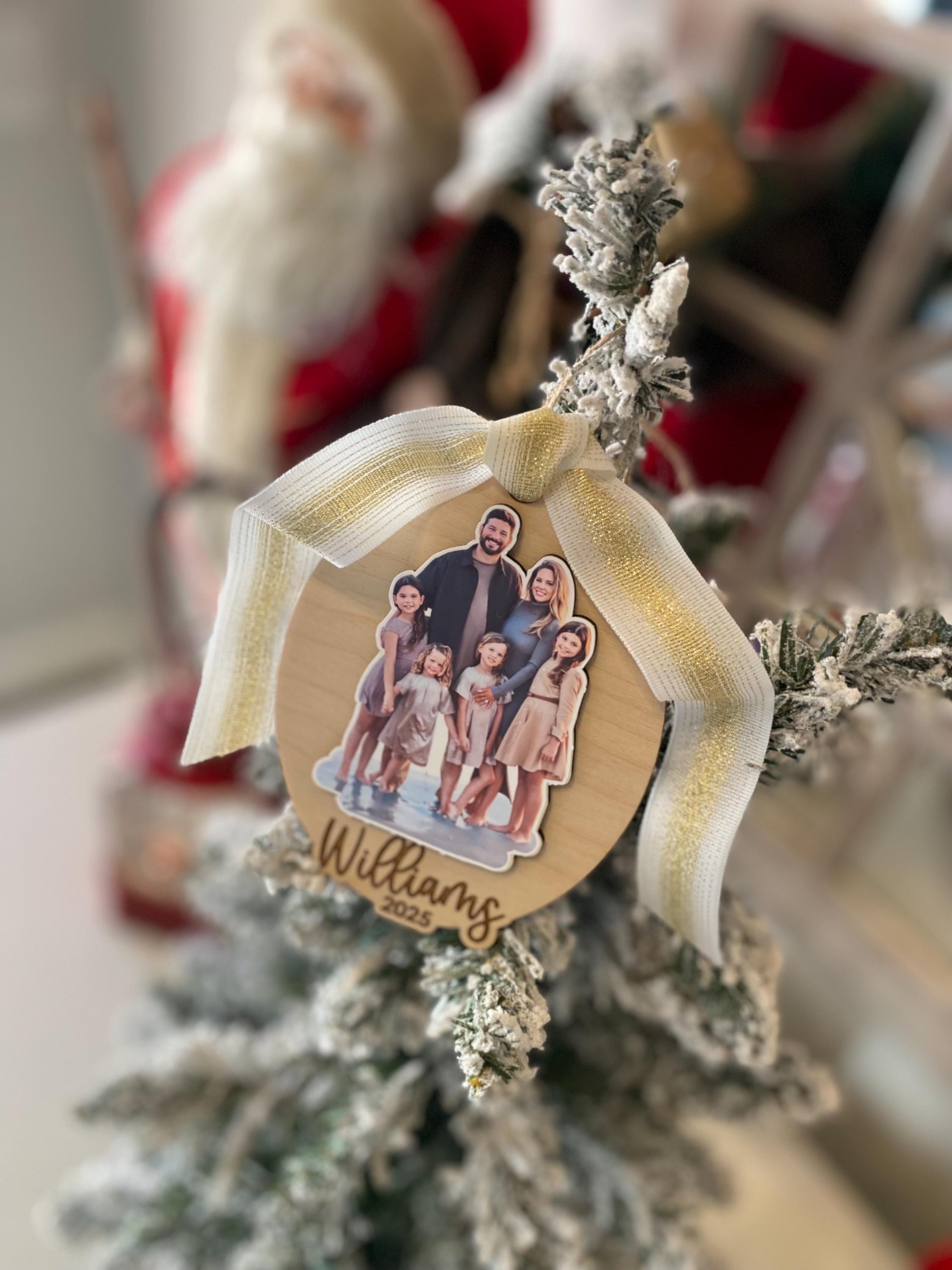 Each ornament features your photo beautifully cut and mounted on a natural wood base, creating a timeless keepsake you’ll cherish for years. A perfect gift for parents, grandparents, teachers, godparents, and your own holiday tree.