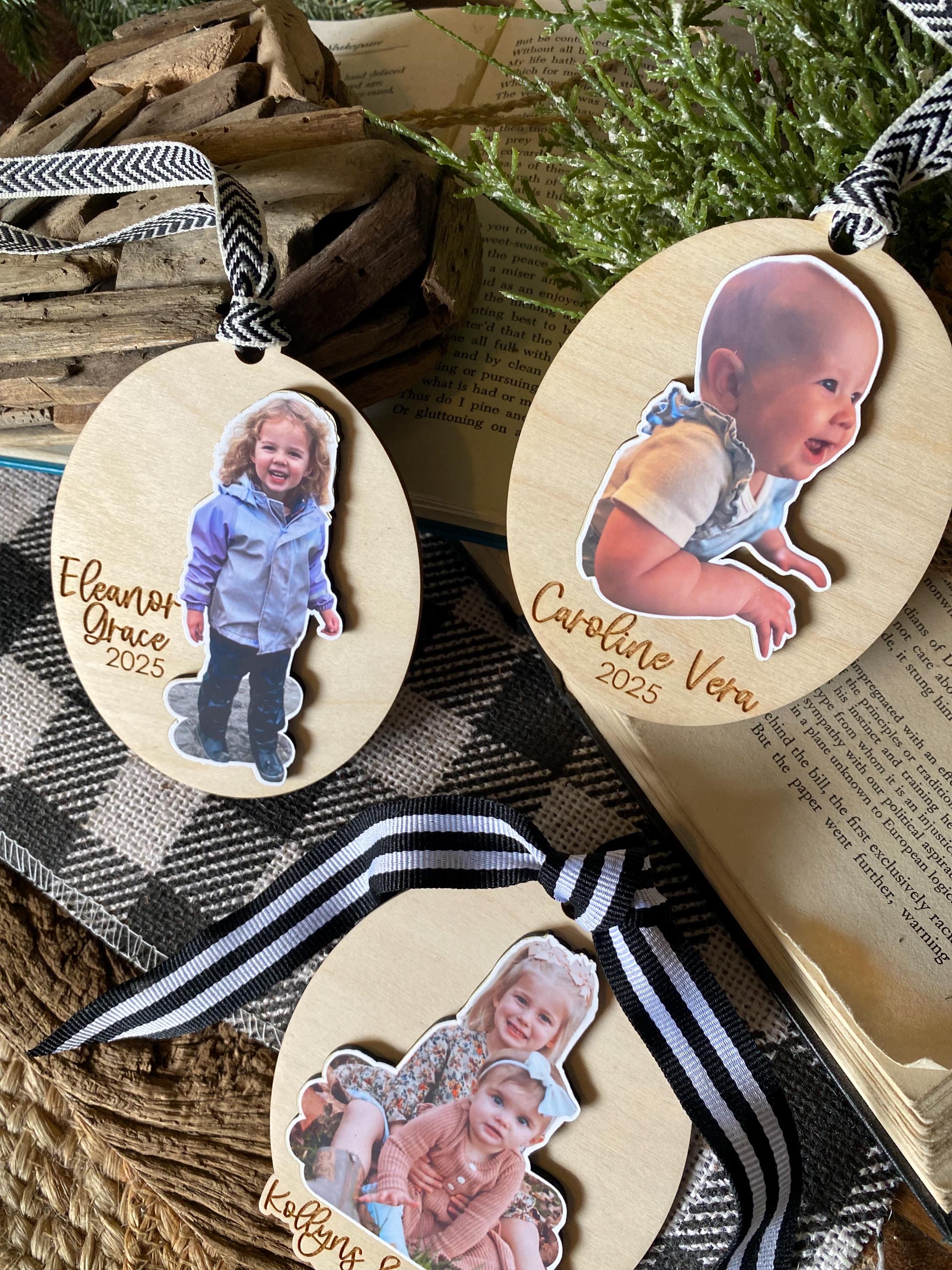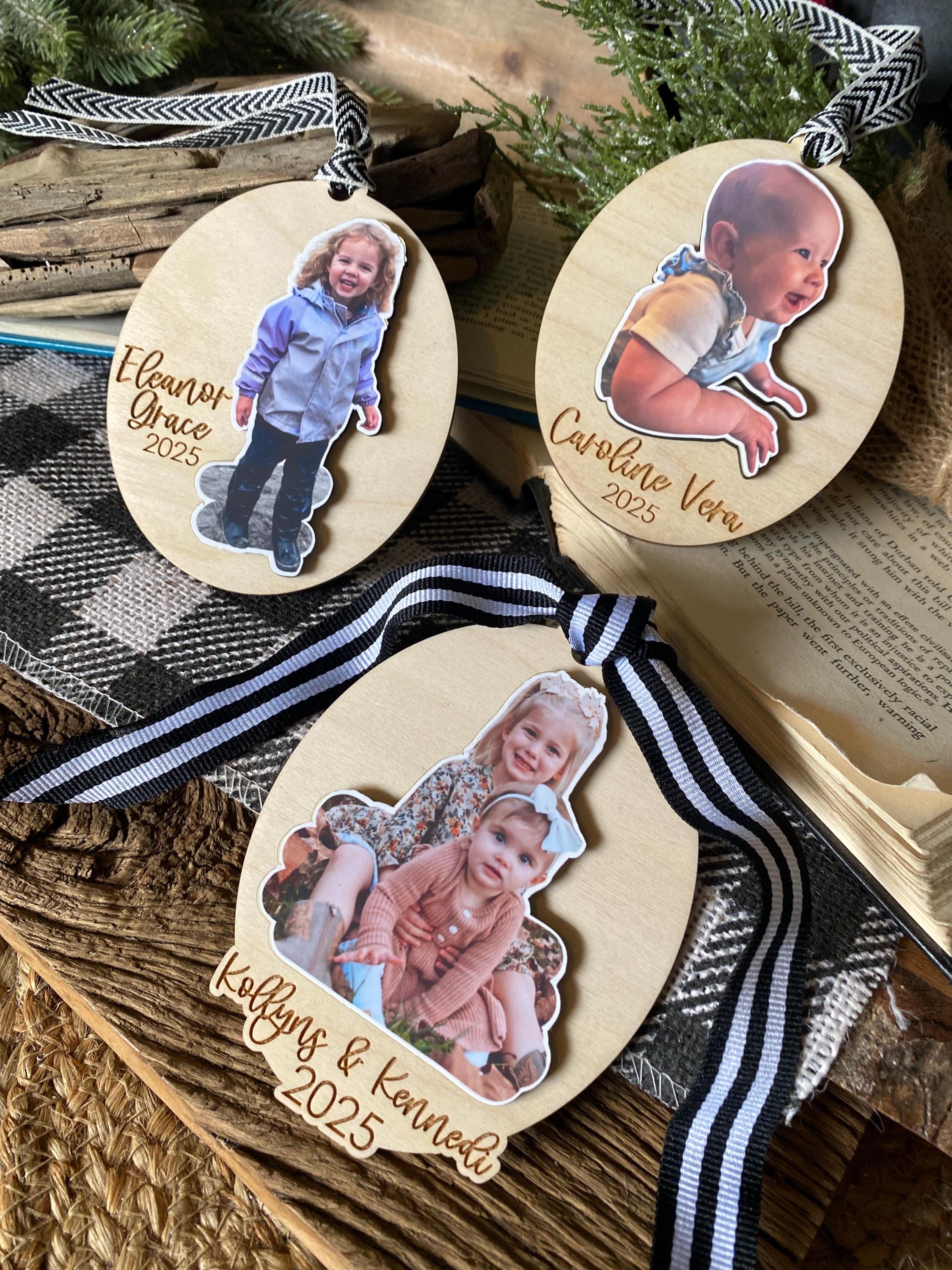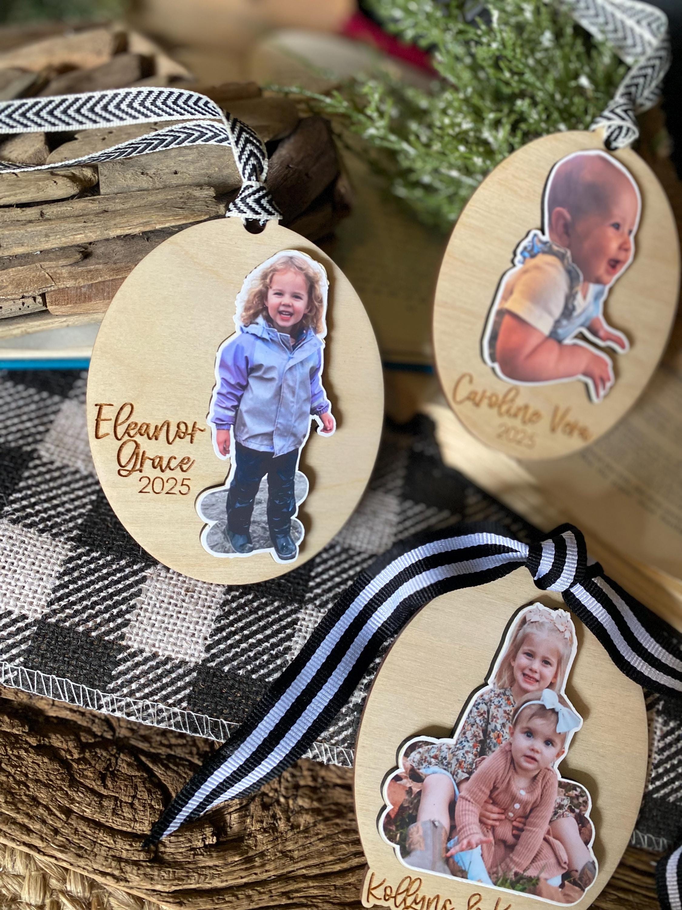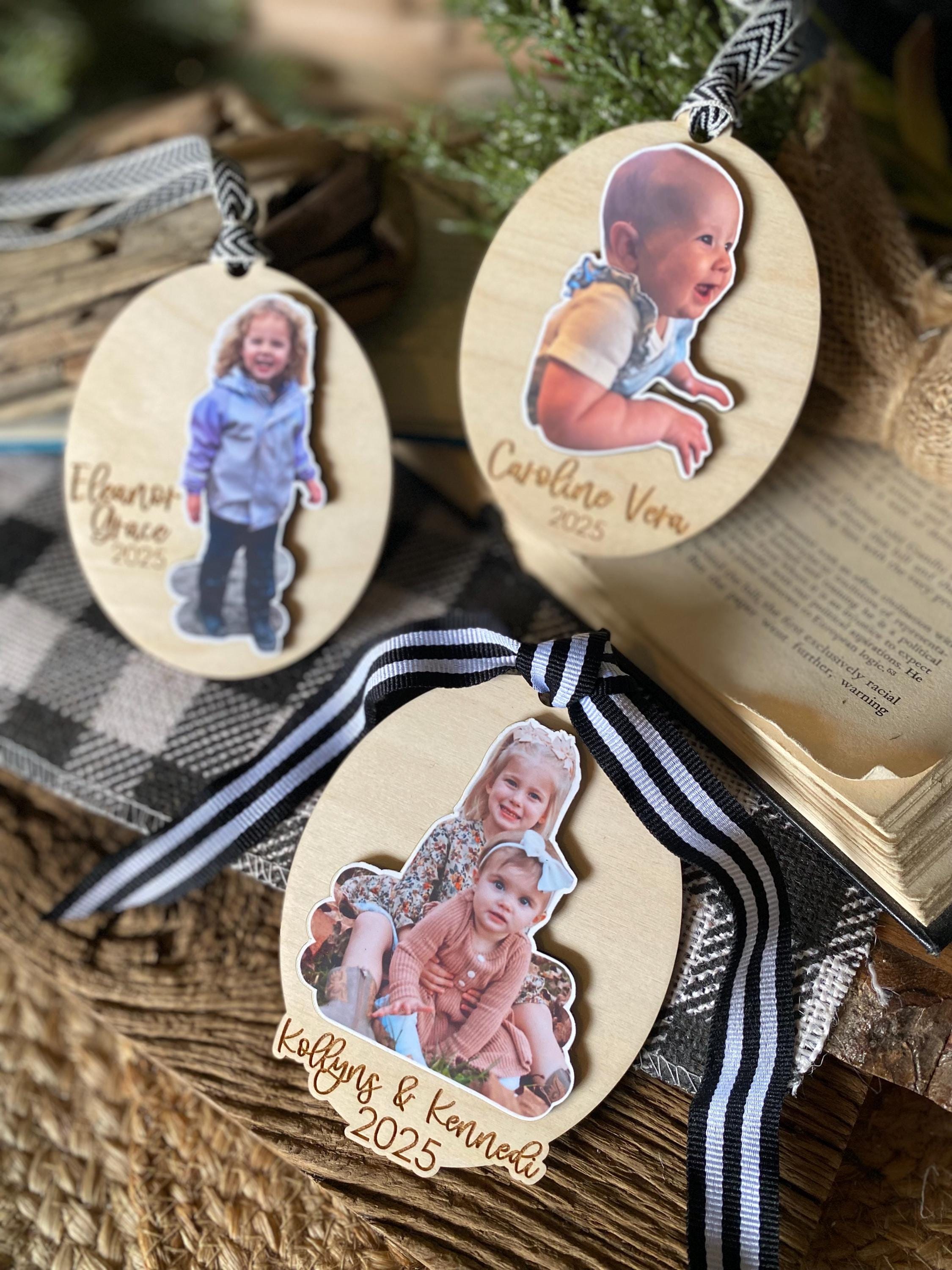 Each ornament features your photo beautifully cut and mounted on a natural wood base, creating a timeless keepsake you’ll cherish for years. A perfect gift for parents, grandparents, teachers, godparents, and your own holiday tree.