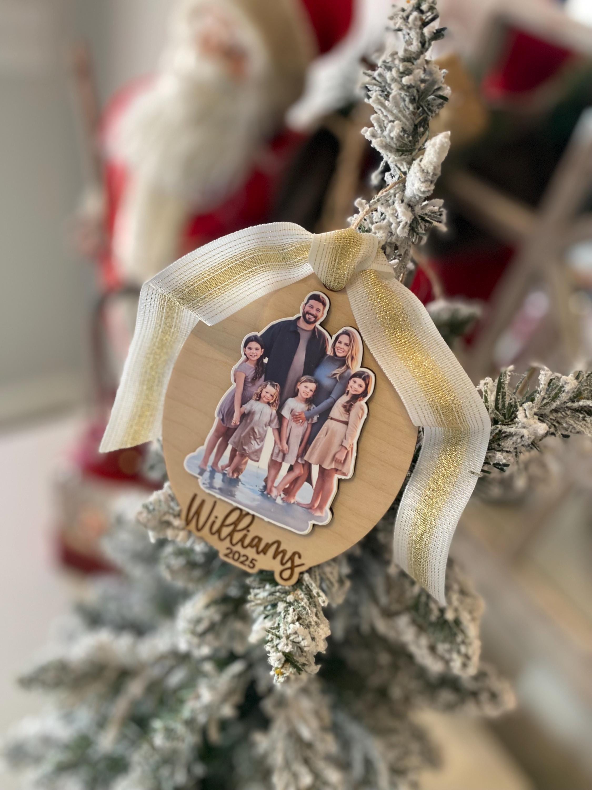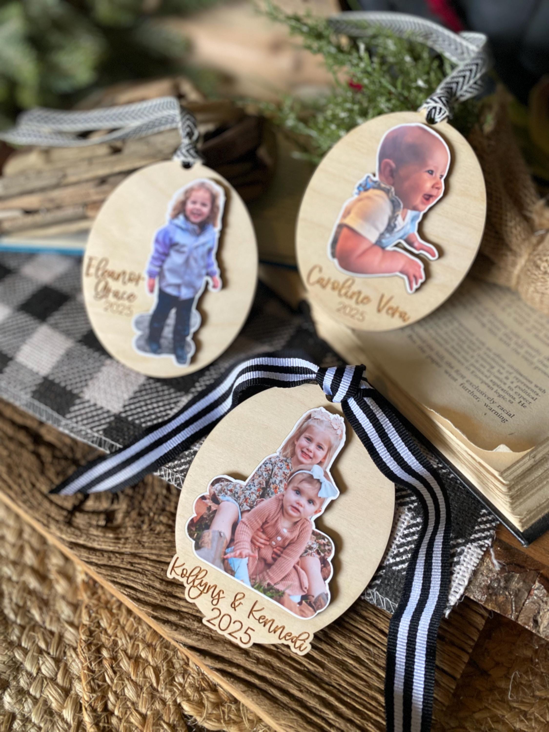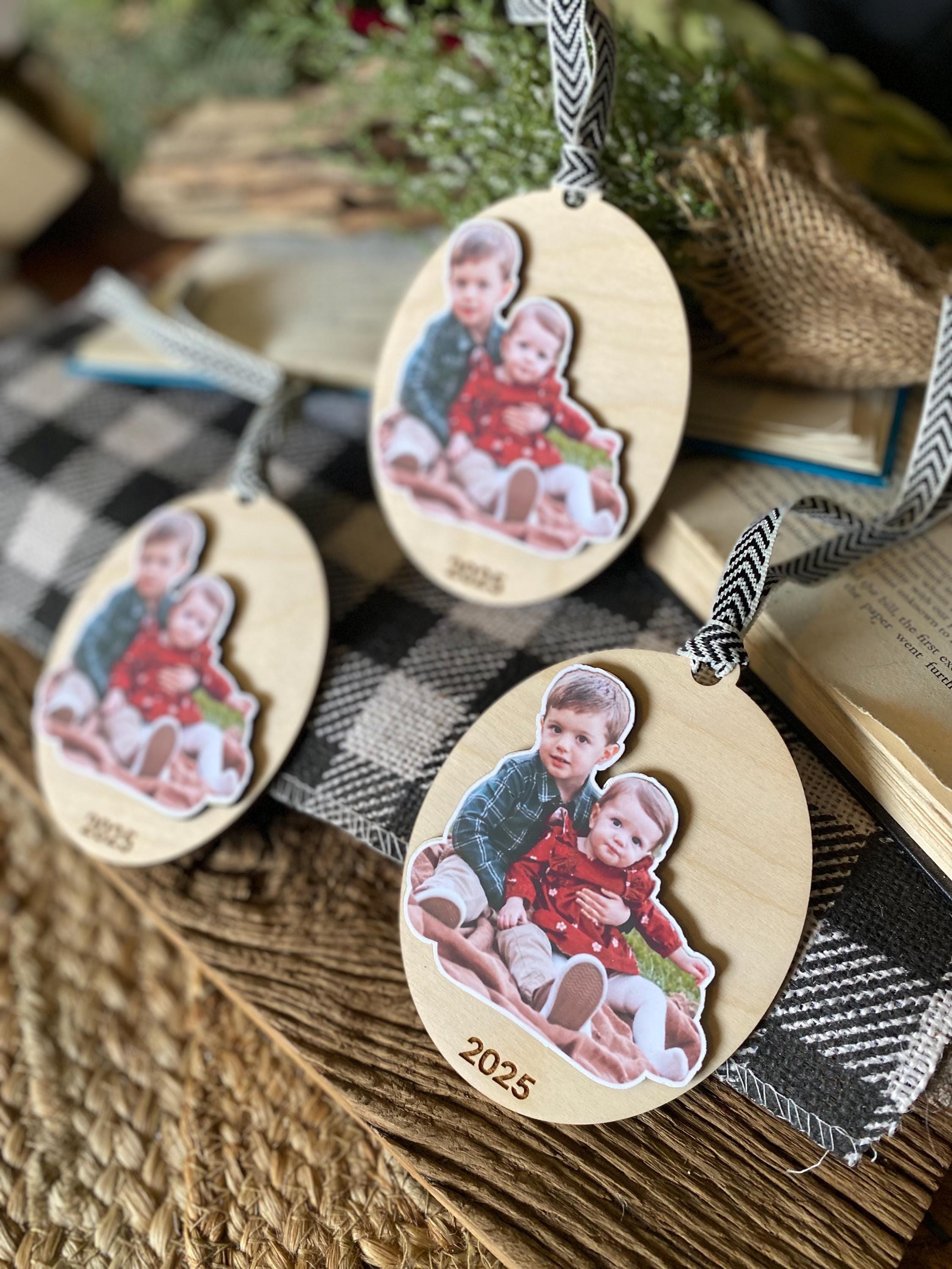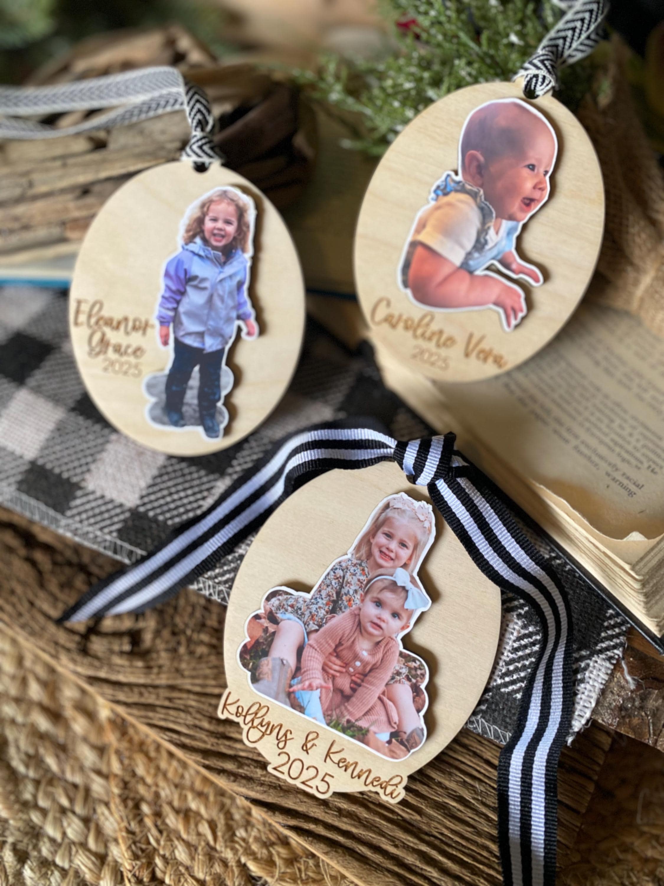 Each ornament features your photo beautifully cut and mounted on a natural wood base, creating a timeless keepsake you’ll cherish for years. A perfect gift for parents, grandparents, teachers, godparents, and your own holiday tree.