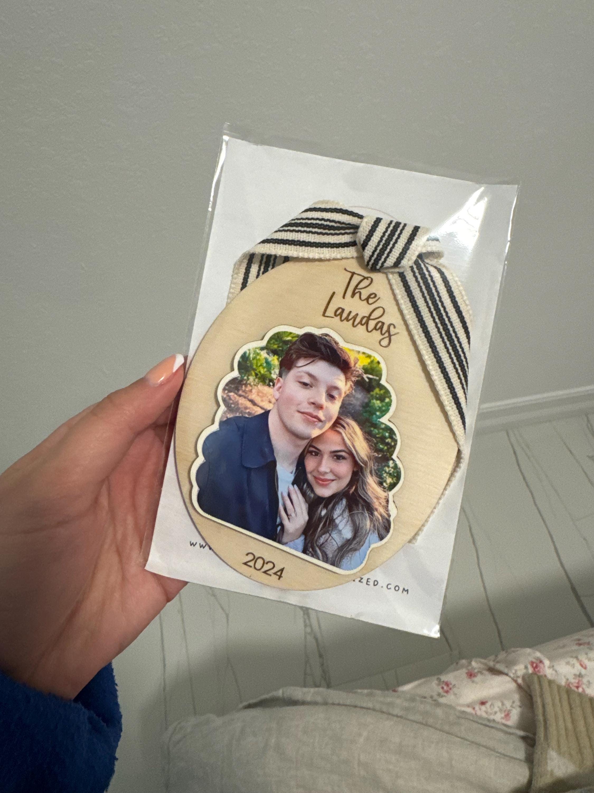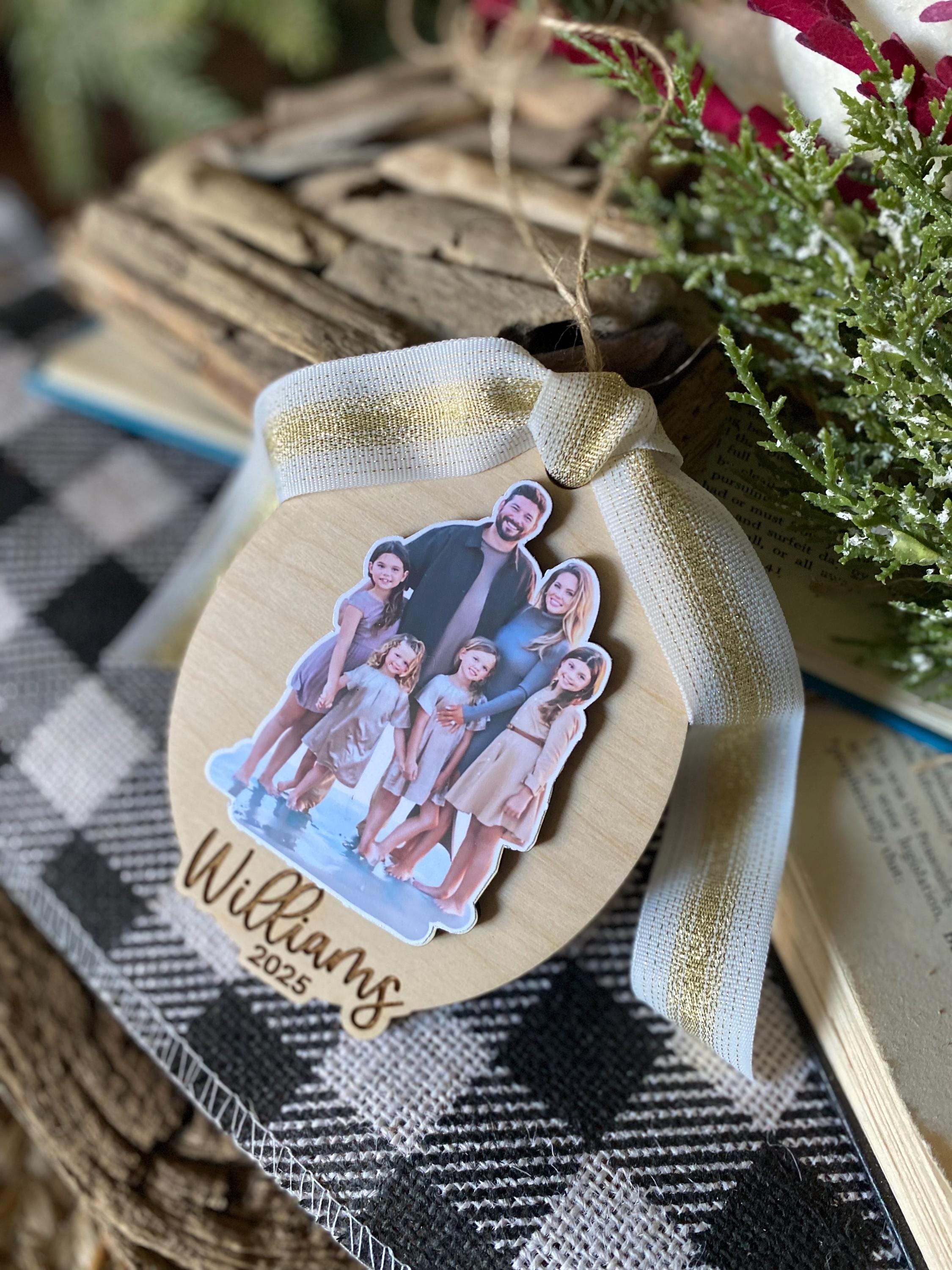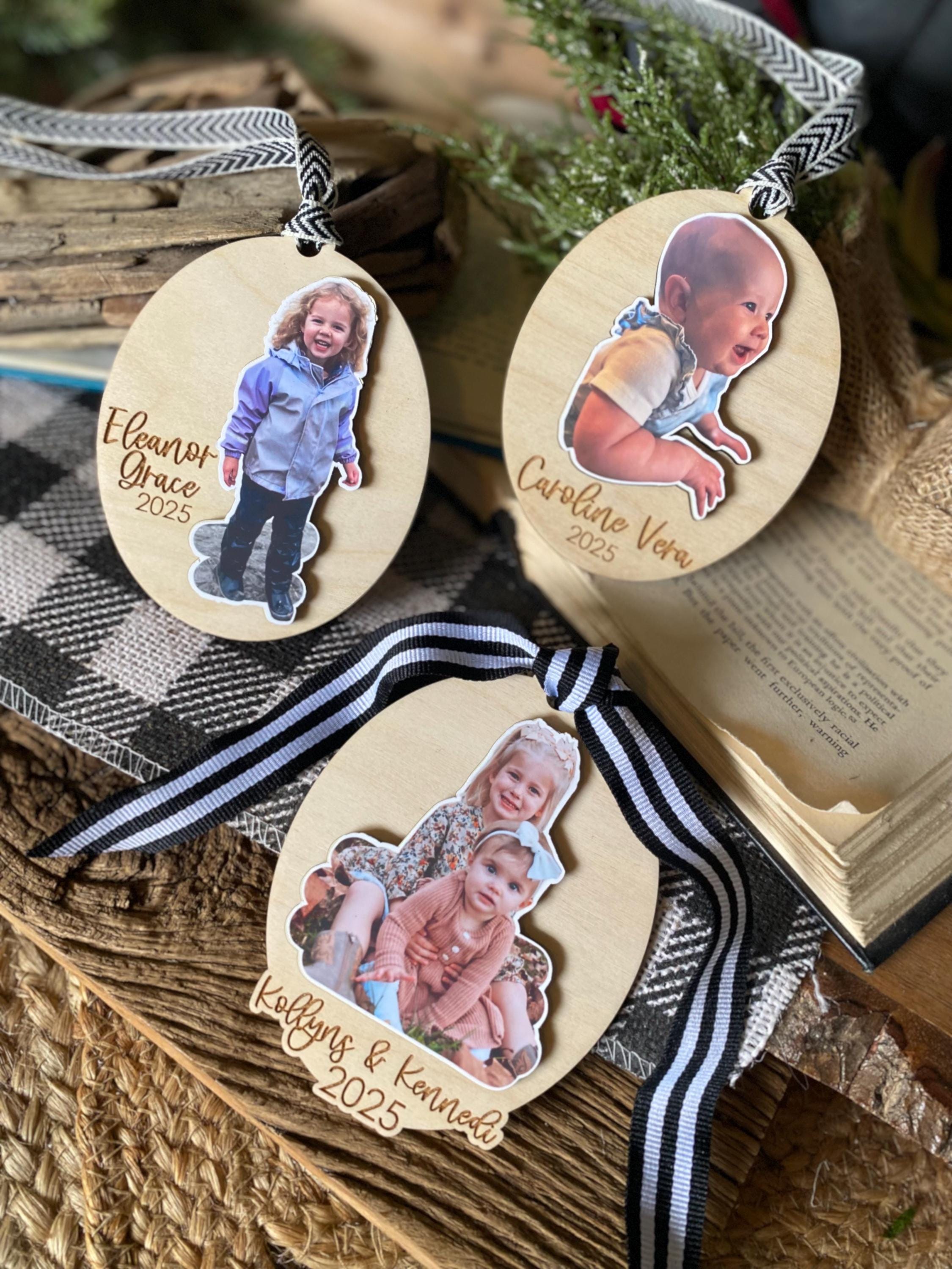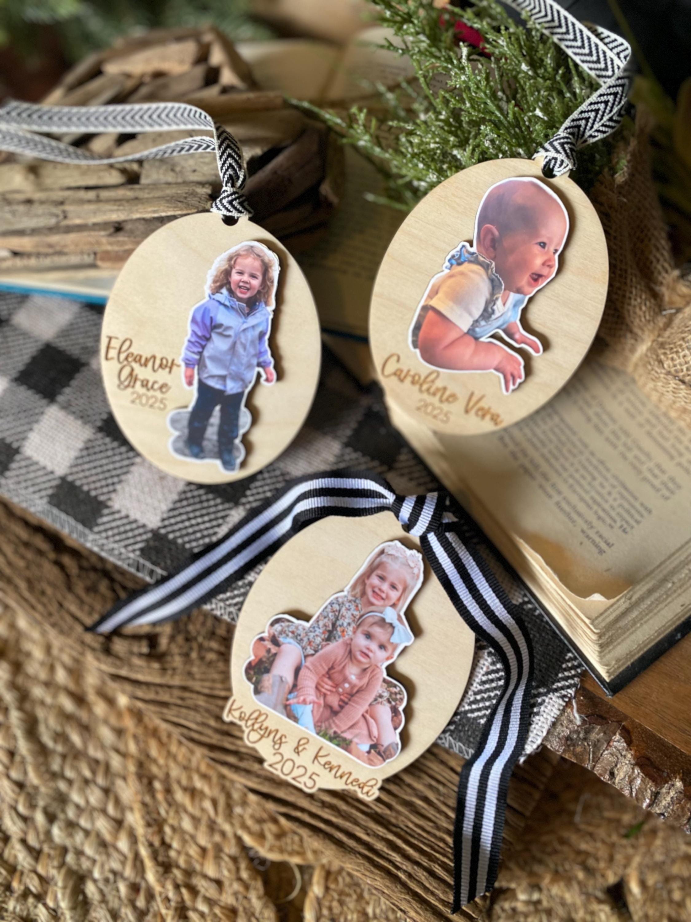 Each ornament features your photo beautifully cut and mounted on a natural wood base, creating a timeless keepsake you’ll cherish for years. A perfect gift for parents, grandparents, teachers, godparents, and your own holiday tree.