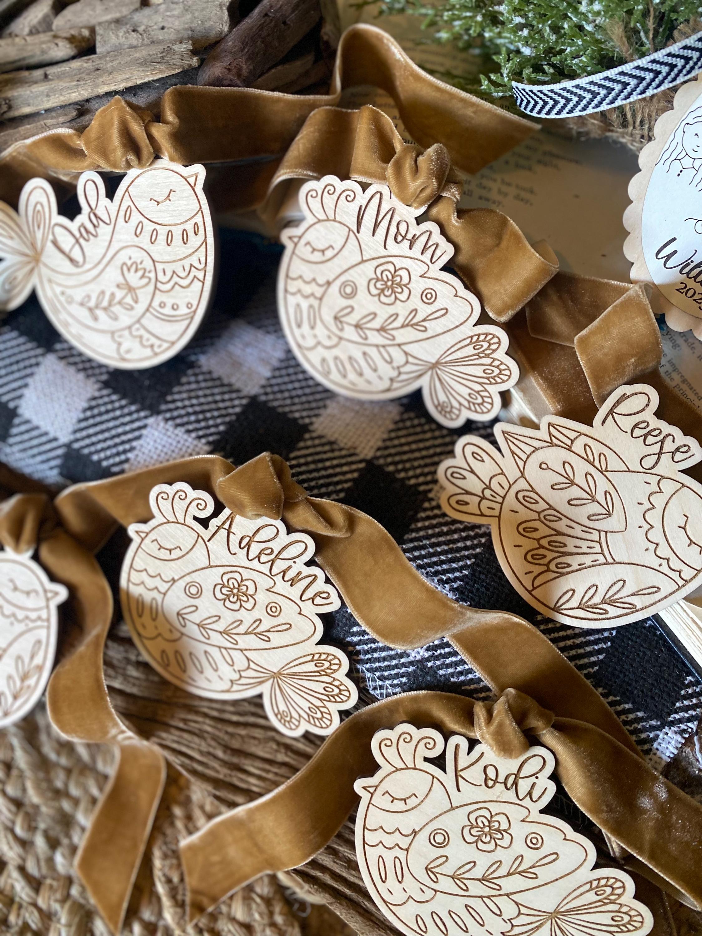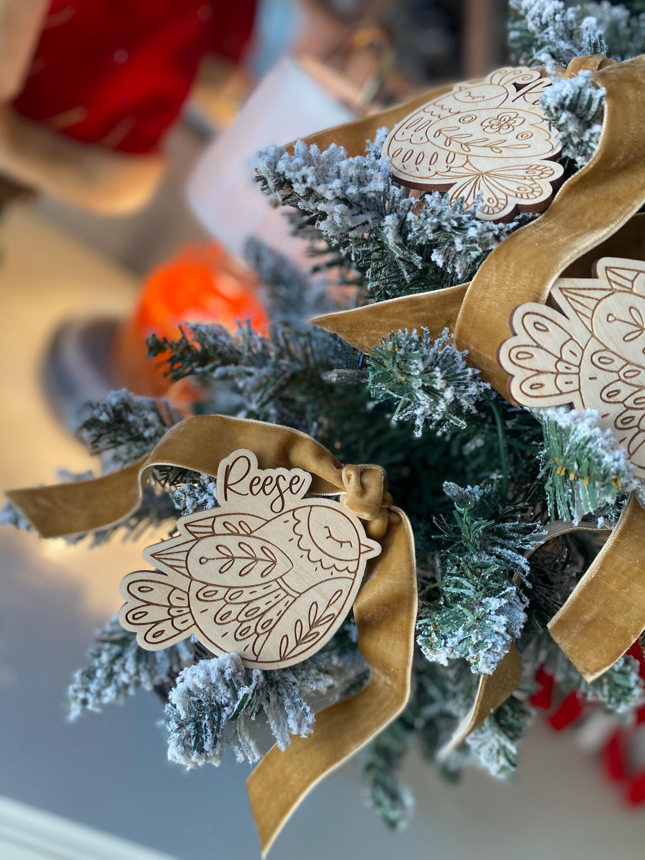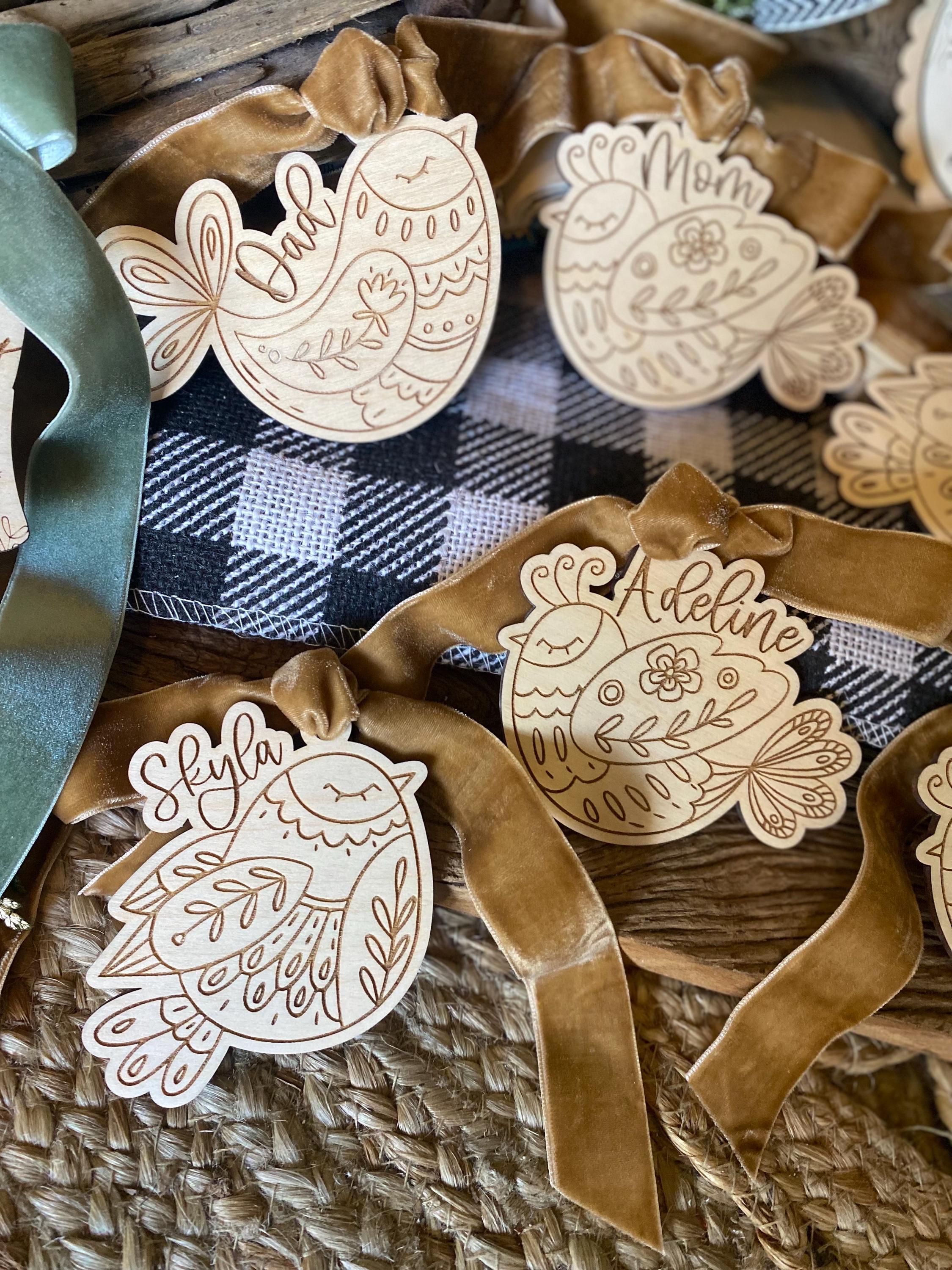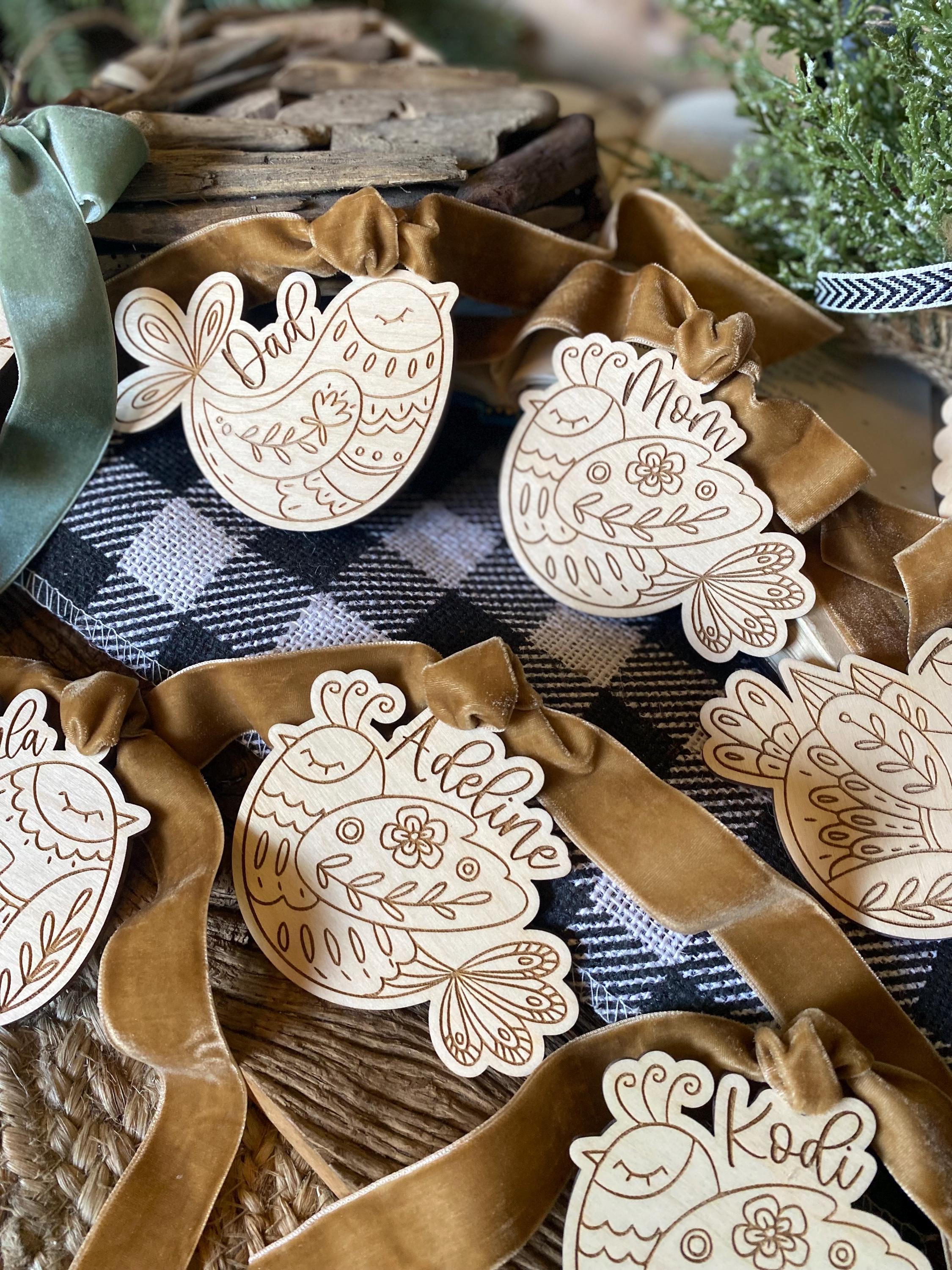 Hand-designed and crafted in our Gracefully Personalized studio, these sweet engraved birds feature whimsical floral and leaf detailing for a warm, handcrafted look your family will love year after year.