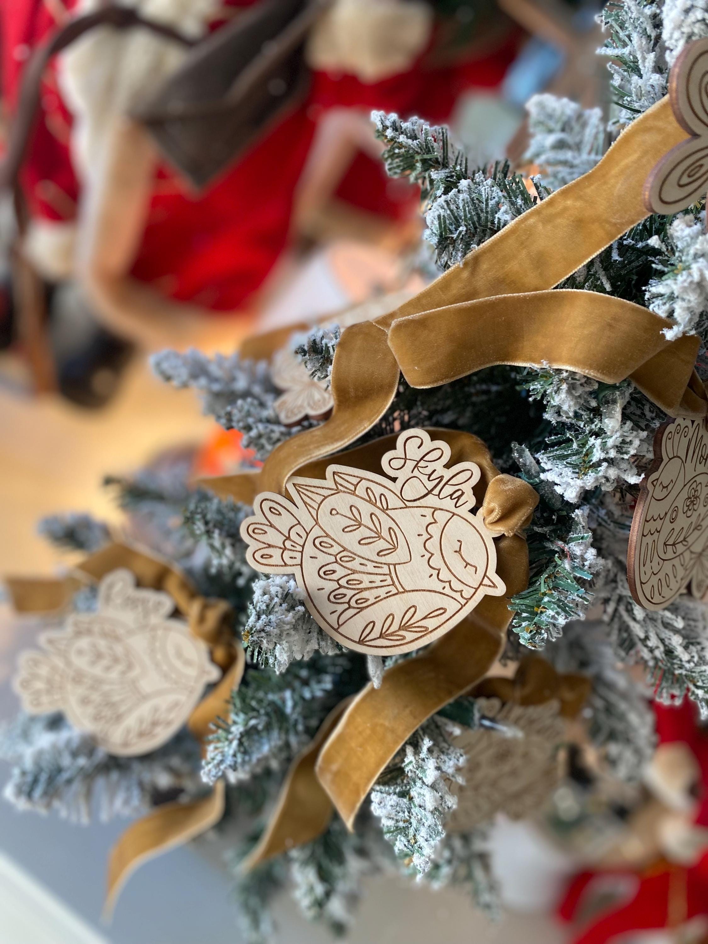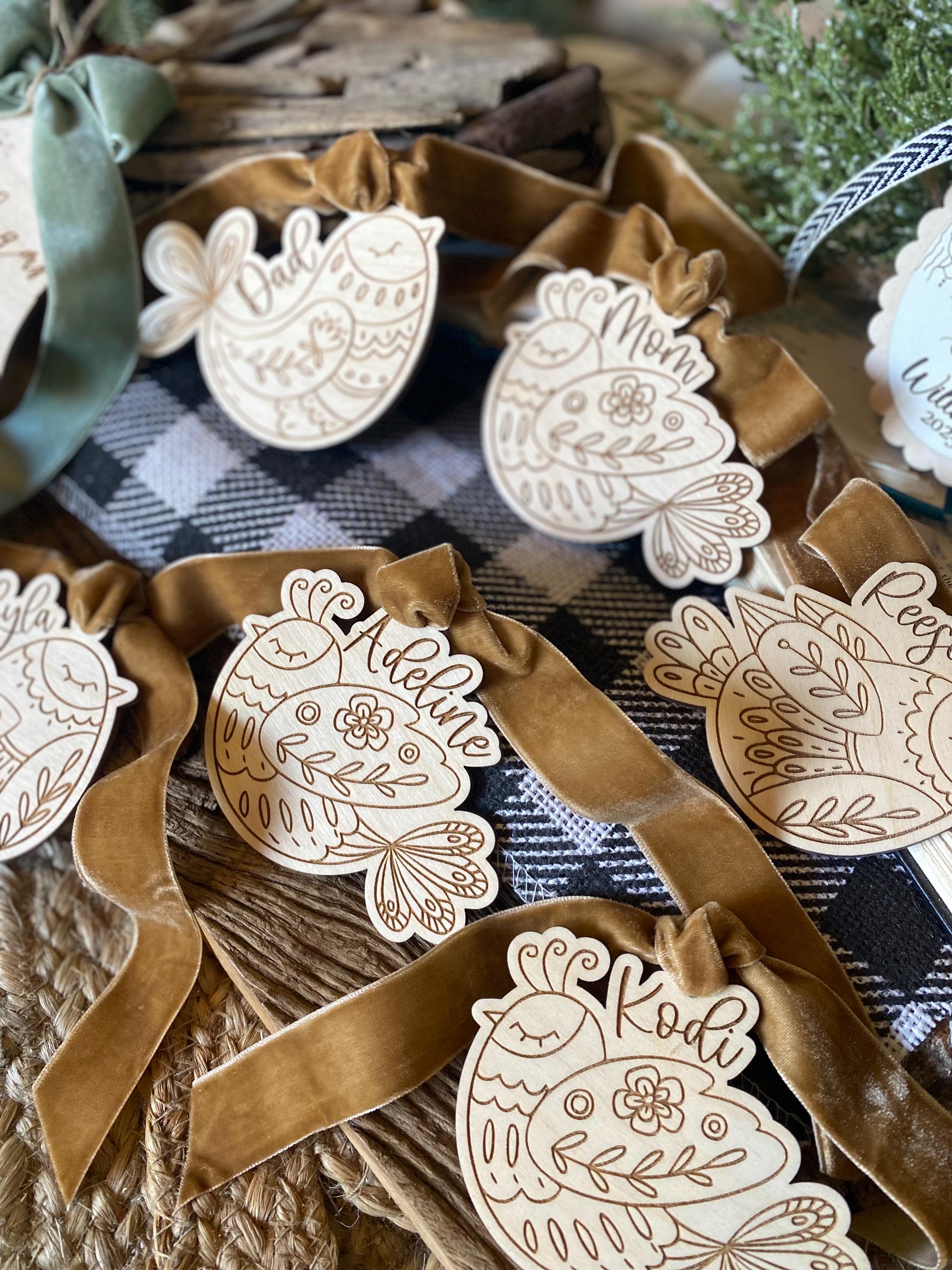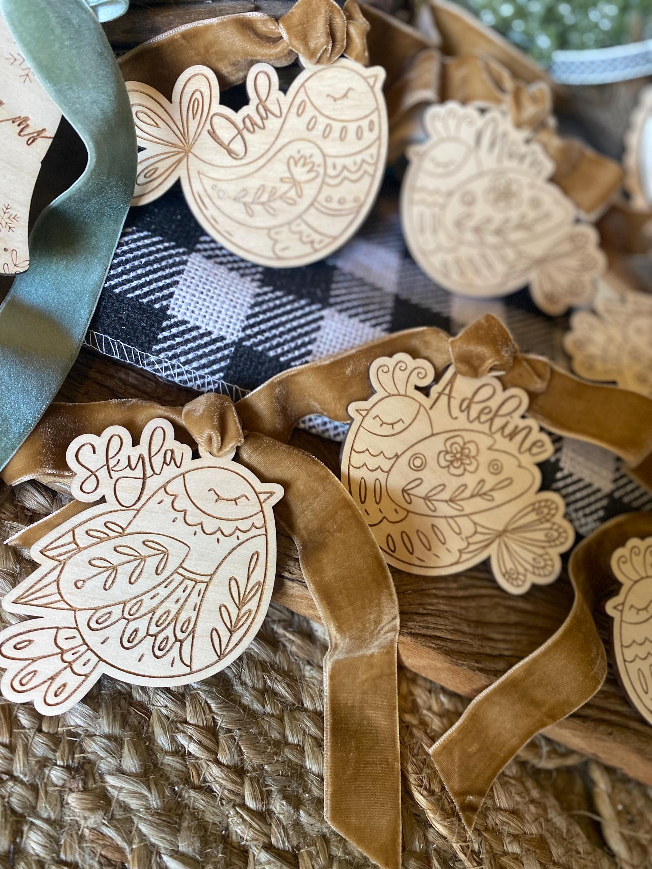 Hand-designed and crafted in our Gracefully Personalized studio, these sweet engraved birds feature whimsical floral and leaf detailing for a warm, handcrafted look your family will love year after year.