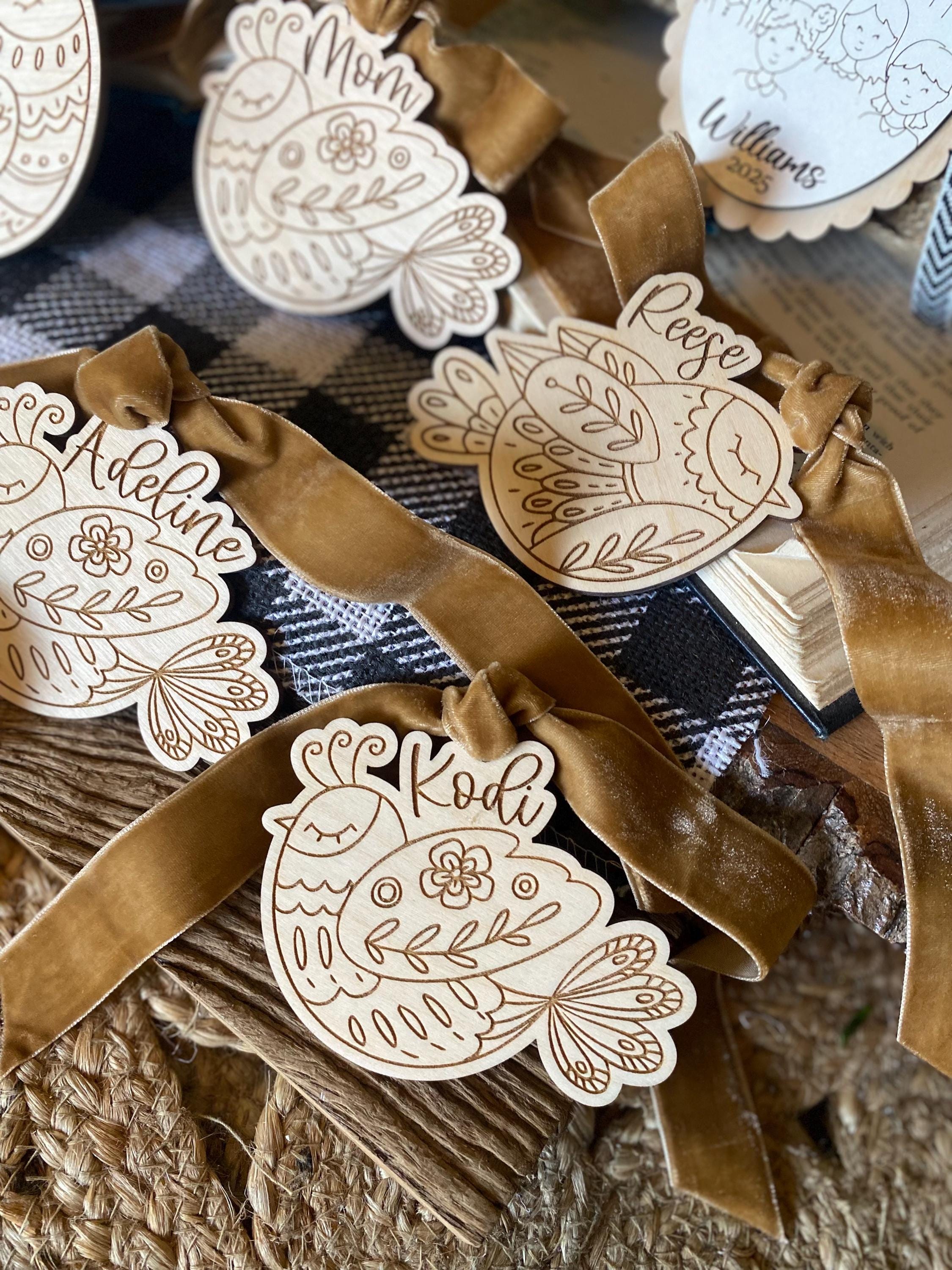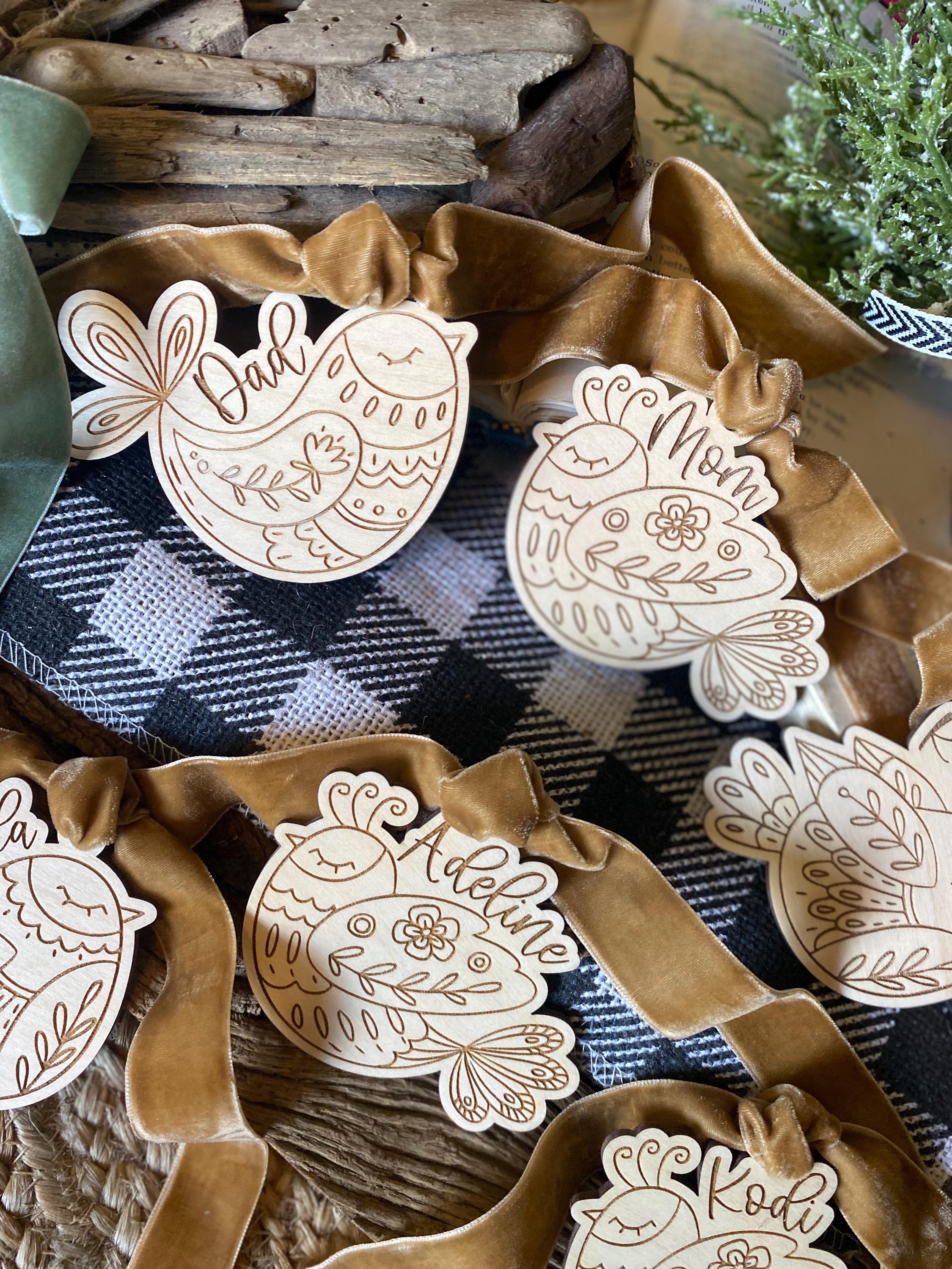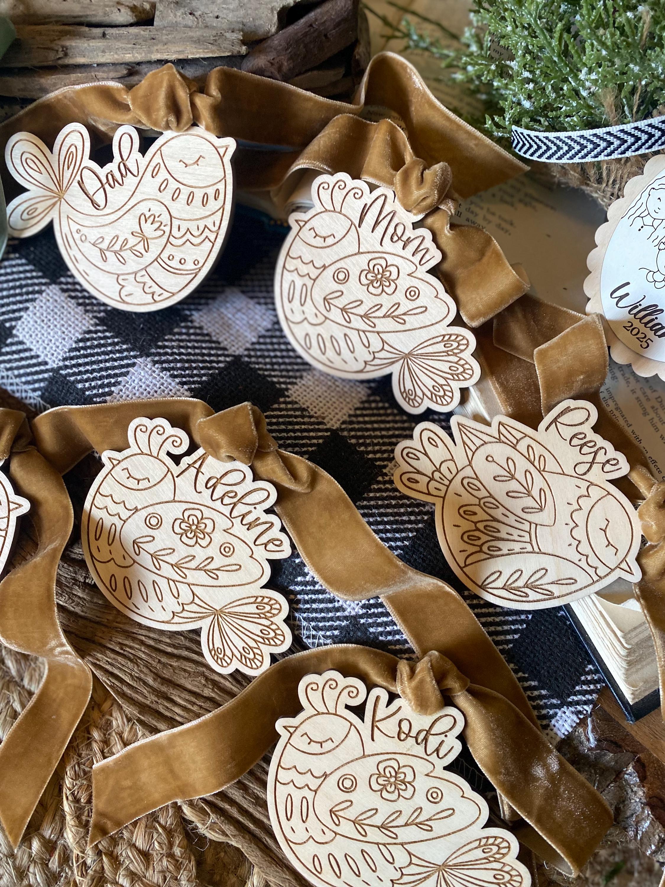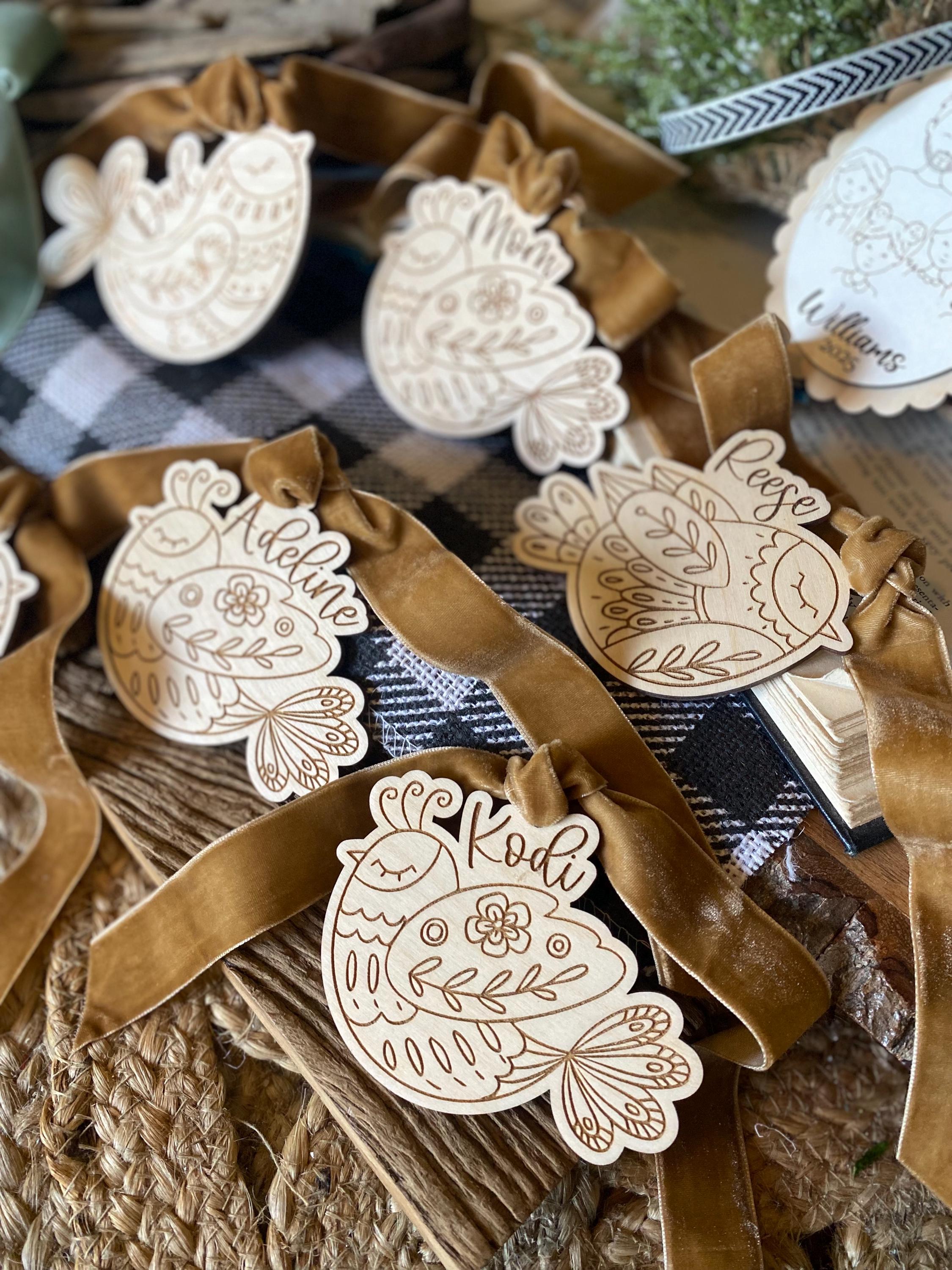 Hand-designed and crafted in our Gracefully Personalized studio, these sweet engraved birds feature whimsical floral and leaf detailing for a warm, handcrafted look your family will love year after year.