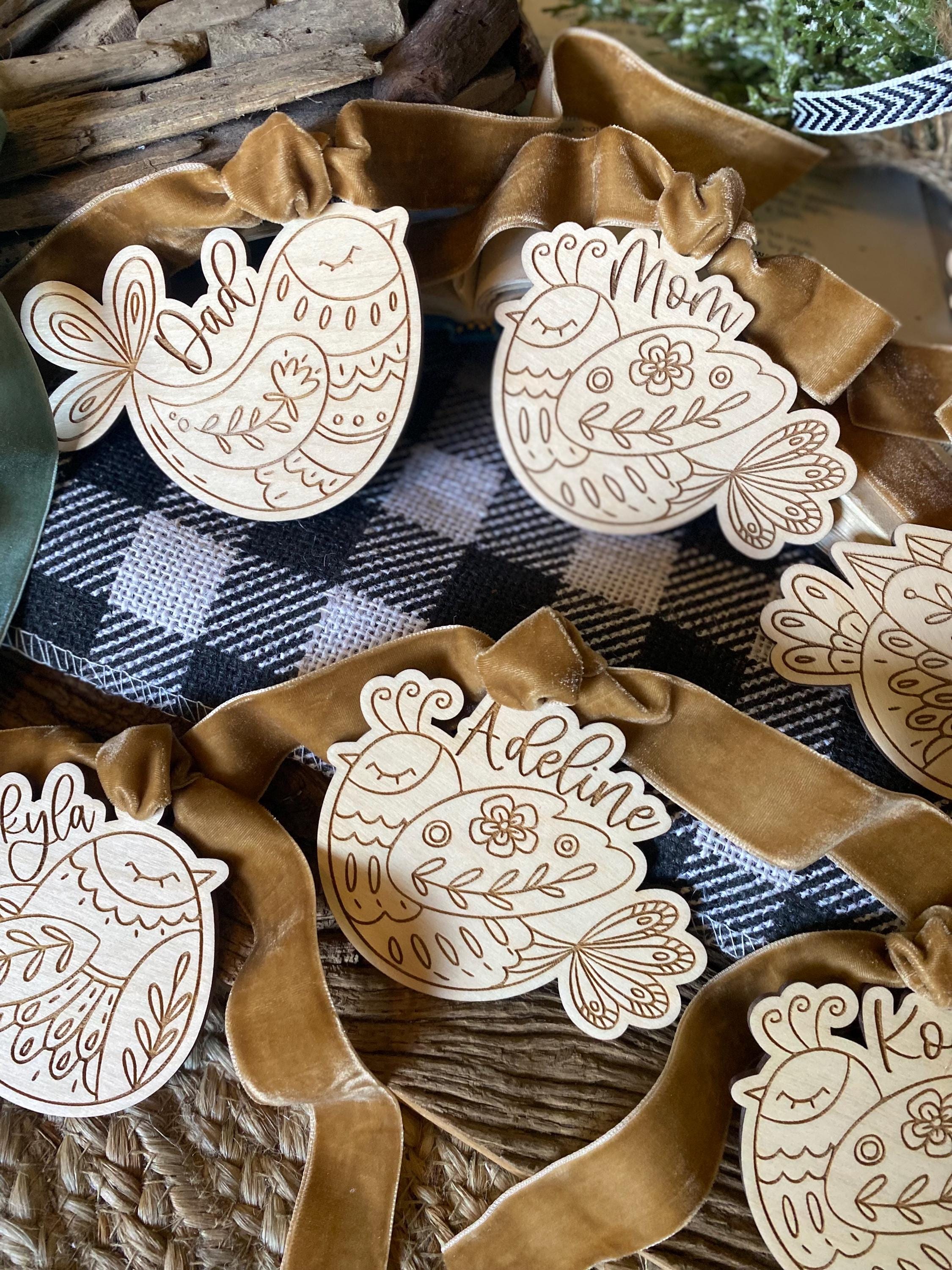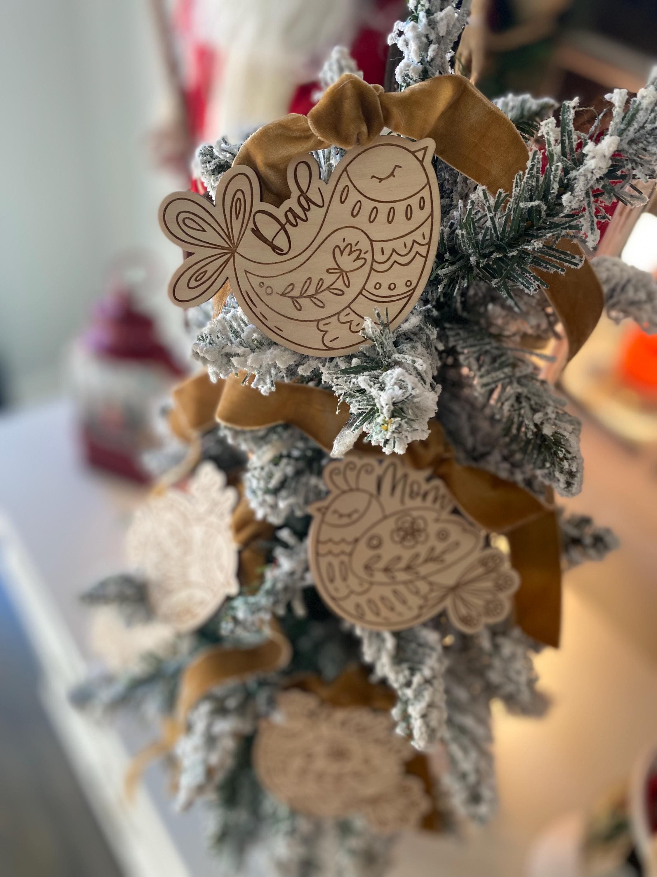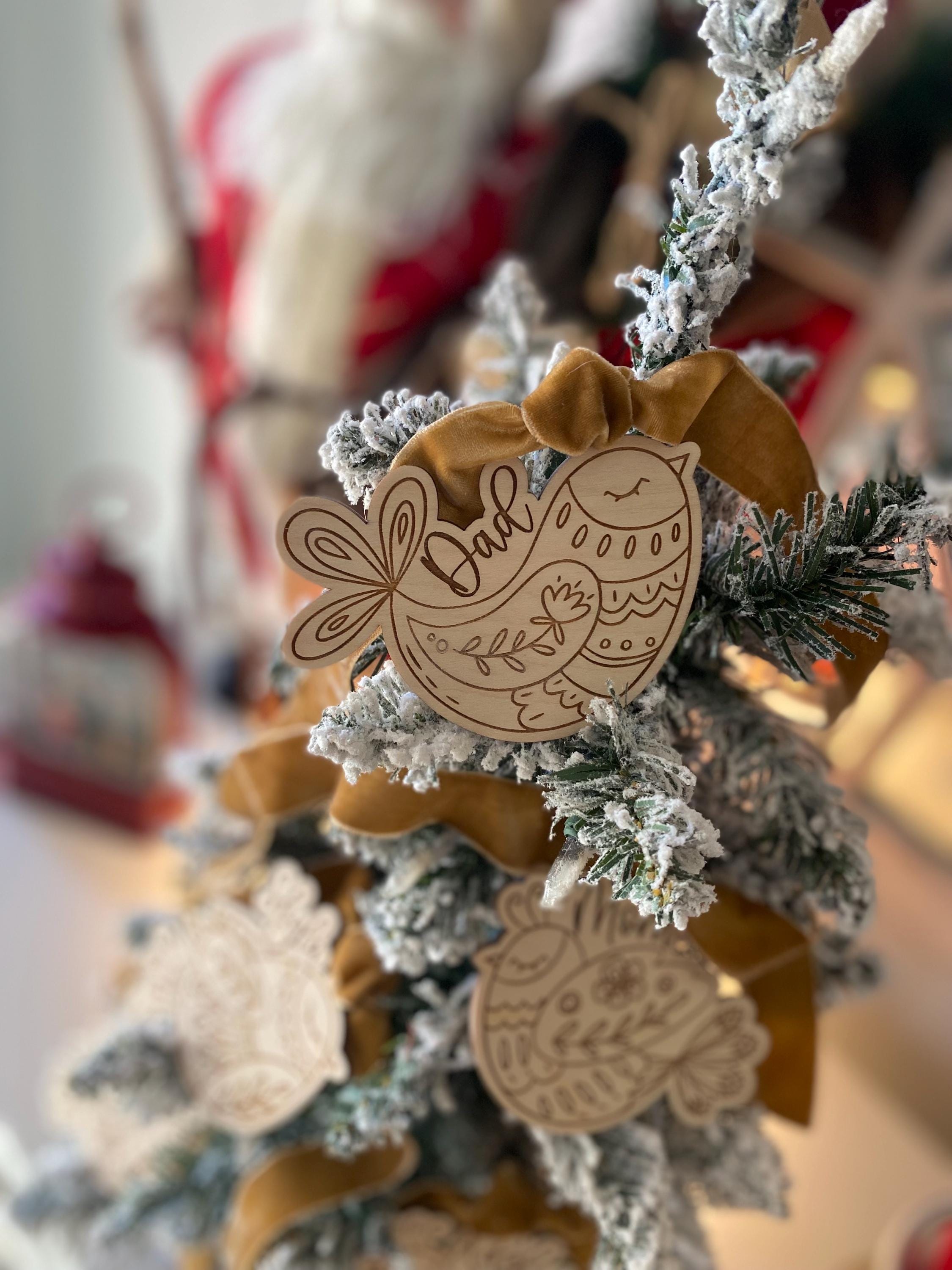 Add a touch of cozy charm to your holiday season with this personalized wooden bird ornament and stocking tag. Each piece is beautifully laser-engraved with your custom name and finished with a ribbon — perfect for Christmas stockings, gift wrapping, tree decorating, or keepsake gifting.